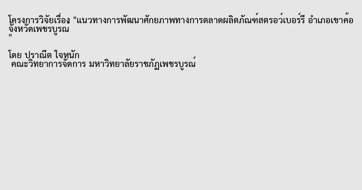การวิจัยเรื่อง “แนวทางการพัฒนาศักยภาพทางการตลาดผลิตภัณฑ์สตรอว์เบอร์รี่ อำเภอเขาค้อ จังหวัดเพชรบูรณ์” มีวัตถุประสงค์เพื่อศึกษาและหาแนวทางการพัฒนาทางด้านการตลาดให้กับผลิตภัณฑ์สตรอว์เบอร์รี่ของเกษตรกรผู้ปลูกสตรอว์เบอร์รี่ในอำเภอเขาค้อ จังหวัดเพชรบูรณ์ โดยเน้นไปที่การพัฒนาส่วนประสมทางการตลาด (Marketing Mix: 4Ps) เพื่อพัฒนาเกษตรกรผู้ปลูกสตรอว์เบอร์รี่ให้มีศักยภาพทางการตลาด และเกิดความเข้มแข็งในการทำการเกษตรที่มีประสิทธิภาพต่อไป โดยจะมีการใช้วิธีการสังเกตในเรื่องของการนับจำนวนแปลงของการปลูกสตรอว์เบอร์รี่ และบริเวณพื้นที่ปลูกสตรอว์เบอร์รี่ และใช้วิธีการสัมภาษณ์ประชากรกลุ่มเป้าหมายคือเกษตรกรผู้ปลูกสตรอว์เบอร์รี่ในเขตอำเภอเขาค้อ จังหวัดเพชรบูรณ์ จำนวน 80 ราย ด้านข้อมูลทั่วไป และสัมภาษณ์ประชากรกลุ่มตัวอย่าง จำนวน 10 ราย ในด้านการตลาด และแนวทางการพัฒนาทางด้านการตลาด เพื่อให้ทราบถึงปัญหาและความต้องการในการพัฒนาศักยภาพทางการตลาด โดยใช้เครื่องมือในการวิจัยจากการสัมภาษณ์เชิงลึก (Individual depth interview) และการสังเกต (Observation) แบบมีส่วนร่วม