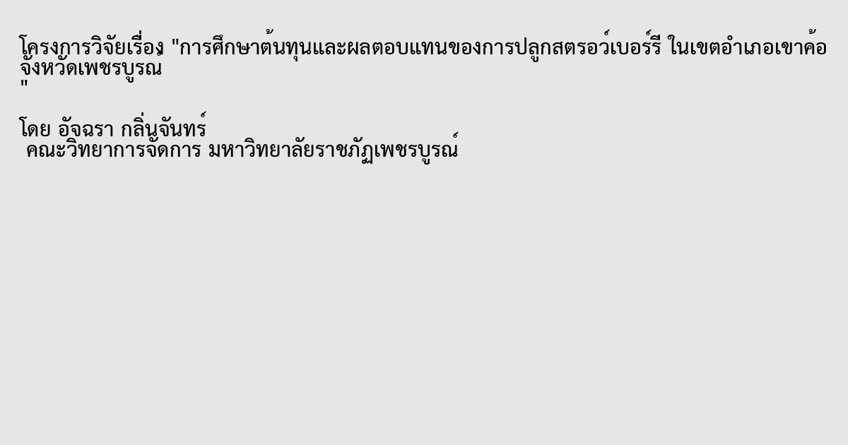 The study the cost and returns of planting strawberry. In Khao Kho Phetchaboon 1. The purpose is to study the context of growing strawberry in Khao Kho, Phetchabun 2. To study the cost and rewards of growing strawberry in Khao Kho, Phetchabun 3. To study the cost and benefit. Higher returns Collection of journals Documents and interviews with staff Agricultural Khao Kho. Associated Questionnaires and strawberry growers in Khao Kho. A total of 80 plots scattered in Khao Kho. Has since grown to be one until four acres, mostly planted along the route to the major tourist attraction of his neck. Farmers start preparing soil Conversion to planting strawberry from July onwards and strawberry will start to be sold in stores in November. Until March of each year planting strawberries in this division of the land into three sizes: small, growing area of less than one sized areas planted 3 rai and a large planted area of 4 rai analysis. Data showed that planting strawberries of small farm. Total cost 580,259 baht compensation includes 1,972,806 baht and net income 1,392,549 baht, the net present value (NPV) is equal to 1,139,897 baht, which is more than 0 internal rate of return (IRR) is equal to 50%. is greater than the discount rate to be determined is a 7 percent return on cost (B/C ratio) is equal to 3.41, which is greater than one, and the payback period (PB) is equal to 5.4 months of farm size. Total cost 1,144,265 baht total return 4,356,999 baht and net income 3,212,734 baht, the net present value (NPV) is equal to 2,723,840 baht, which is more than 0 internal rate of return (IRR) is equal to 57% of. Is greater than the discount rate to be determined is a 7 percent return on cost (B/C ratio) is equal to 4.27, which is greater than one, and the payback period (PB) is equal to four months hectares large. The total cost of 2,120,961 total return and net income 4,272,088 6,393,049 baht, with a net present value (NPV) is equal to 3,697,142 baht, which is of great value and internal rate of return greater than 0. Internal rate of return is equal to 42%, which is greater than the discount rate to be determined is a 7 percent return on cost (B/C ratio) is equal to 3.03, which is greater than one, and the payback period (PB) is equal to 6.6 months. So you can see that planting strawberry are reasonable and are worth the investment. By comparison, you can see that. Planting strawberry plants of medium is suitable and attractive as possible. A minor field of small and large, respectively.