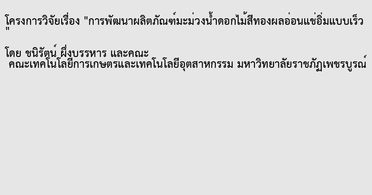 งานวิจัยนี้มีวัตถุประสงค์ เพื่อศึกษาสูตรพื้นฐานของมะม่วงเบาแช่อิ่ม สร้างสูตรมาตรฐานของมะม่วงน้ำดอกไม้สีทองผลอ่อนแช่อิ่มแบบเร็ว และศึกษาอายุการเก็บรักษา มีวิธีการทดลองศึกษาสูตรพื้นฐานมะม่วงเบาแช่อิ่ม 3 สูตร และทา การประเมินผลทางประสาทสัมผัส สูตรที่ได้รับการคัดเลือก คือสูตรที่ 3 มีมะม่วงเบา เกลือ น้าปูนใส น้ าตาลทราย และน้ำ ส่วนประกอบ ในอัตราส่วน ร้อยละ 29.41 9.80 24.02 19.61 และ 17.16 ตามลำดับ และนำไปสร้างสูตรมาตรฐานของมะม่วงน้ำดอกไม้สีทองผลอ่อนแช่อิ่มแบบเร็ว ประเมินผลทางประสาทสัมผัสสูตรที่ได้รับการคัดเลือก คือ สูตรที่ 2(แช่น้ำ ปูนใสกับน้ำสารส้ม) มีมะม่วงน้ำดอกไม้สีทองผลอ่อน น้ำเกลือ น้ำปูนใส น้ำสารส้ม น้ำตาลทราย(1) น้ำ(1) น้ำตาลทราย(2) น้ำ(2) และ กรดซิตริก เป็ นส่วนประกอบใน อัตราส่วน ร้อยล ะ 21.27 17.02 9.57 9.57 6.38 14.89 10.63 10.63 แ ล ะ 0.04 ตาม ลำดับ การยอมรับของผู้บริโภคในด้านสี กลิ่น รสชาติ เนื้อสัมผัส และความชอบโดยรวม อยู่ที่ระดับความชอบปานกลาง เวลาในการทำมะม่วงน้า ดอกไม้สีทองผลอ่อนแช่อิ่มแบบเร็ว คือ 32 ชั่วโมง ทำการศึกษาอายุการเก็บรักษาของมะม่วงน้ำดอกไม้สีทองผลอ่อนแช่อิ่มแบบเร็วบรรจุถุงปิดผนึก เก็บรักษาที่อุณหภูมิห้อง พบว่า แบบทดลองที่ 1 (ใส่เชื้อดองมะม่วง) มีอายุ 26 วัน แบบทดลองที่ 2 (ไม่ใส่เชื้อดองมะม่วง) มีอายุ 8 วัน และแบบทดลองที่ 3 (อุ่นน้า เชื่อมก่อนบรรจุถุง) มีอายุ 24 วัน