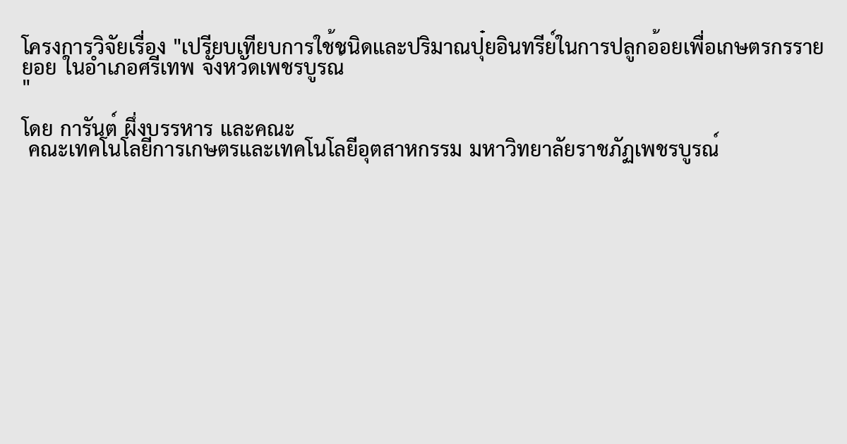 งานวิจัยนี้มีวัตถุประสงค์ เพื่อเปรียบเทียบการใช้ชนิดและปริมาณปุ๋ยอินทรีย์ในการปลูกอ้อย ในจังหวัดเพชรบูรณ์ ทำการทดลองโดยวางแผนการทดลองแบบ Factorial in RBD โดยมี 2 ปัจจัย ปัจจัยที่ 1 ชนิดของปุ๋ยอินทรีย์ ได้แก่ มูลไก่ มูลสุกร กากตะกอนอ้อย และมูลวัว ปัจจัยที่ 2 ปริมาณปุ๋ยอินทรีย์ที่ใส่ อัตรา 500 1,000 1,500 และ 2,000 กิโลกรัมต่อไร่ นา อ้อยพันธุ์ขอนแก่น3 มาปลูกลงในแปลงแบบแถวเดี่ยว ระยะระหว่างแถว 1.5 เมตร ยาวแถวละ 16 เมตร ให้น้ำโดยปล่อยไหลตามร่องครั้งแรก หลังปลูก 10 วัน ปล่อยในสภาพแปลงปลูก และใส่ปุ๋ย แต่ละสิ่งทดลองปล่อยให้เจริญเติบโตในสภาพแปลง และทำการเก็บข้อมูล เมื่ออ้อยอายุ 10 เดือน ทำการบันทึกผลและนำข้อมูลมาวิเคราะห์ค่าความแปรปรวน (analysis of variance : ANOVA) และเปรียบเทียบค่าเฉลี่ยโดยใช้ Least significant difference test (LSD) พบว่า ชนิดและปริมาณปุ๋ยอินทรีย์ในการปลูกอ้อย ต่อองค์ประกอบผลผลิตบางส่วนของอ้อยปลูก พบว่า ชนิดปุ๋ยอินทรีย์ที่แตกต่างกันส่งผลต่อความสูงของลา ต้นอ้อย จำนวนปล้องต่อลำ และน้ำหนักต่อไร่ ซึ่งน้ำหนักต่อไร่มูลสุกรให้ค่าเฉลี่ยสูงสุดแต่ไม่แตกต่างกับกากตะกอนอ้อยและมูลวัว สาหรับปริมาณการใส่ พบว่า อัตราการใส่ 500,1,000 และ1,500 ให้ค่าเฉลี่ยที่สูงกว่าอัตรา 2,000 กิโลกรัมต่อไร่ ทางด้านความสูงของลาต้นอ้อยจำนวนปล้องต่อลำ น้ำหนักต่อไร่ ในขณะที่ชนิดปุ๋ยอินทรีย์และปริมาณที่ใส่ไม่ส่งผลต่อค่าเฉลี่ยความหวาน (บริกซ์เปอร์เซ็นต์) ดังนั้น การเลือกชนิดปุ๋ยอินทรีย์ควรเลือกชนิดที่ราคาถูกและมีมาก