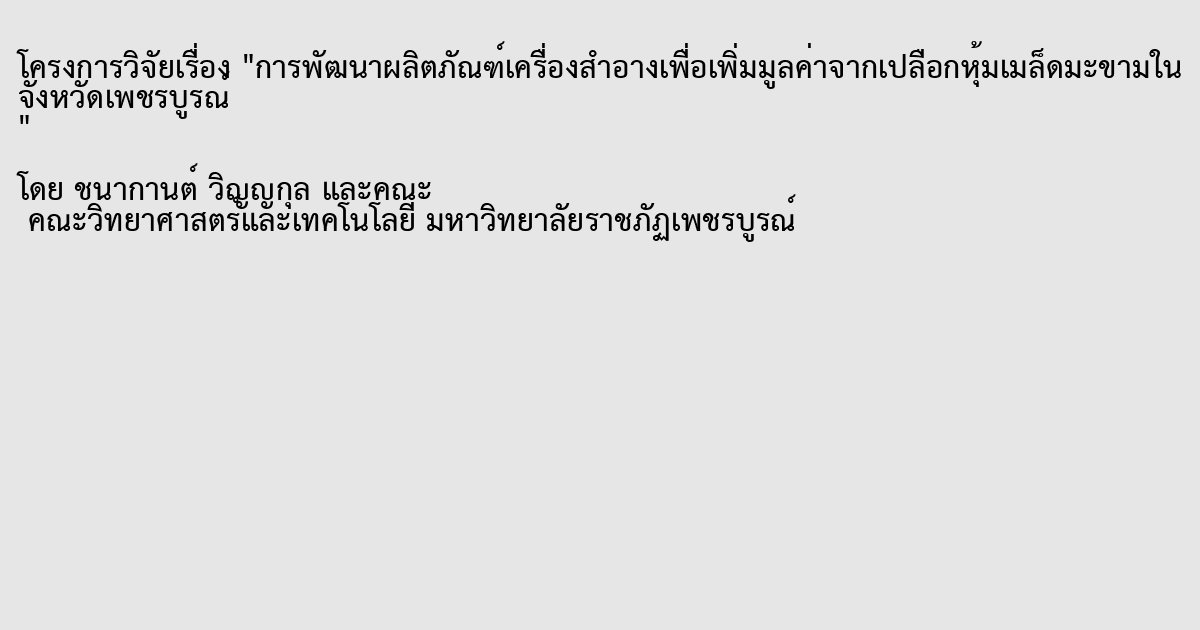 งานวิจัยนี้มีวัตถุประสงค์เพื่อนำสารประกอบฟีนอลิกที่ได้จากการสกัดจากเปลือกหุ้มเมล็ดมะขามมาพัฒนาและประยุตก์ใช้ในผลิตภัณฑ์เครื่องสำอาง ในงานวิจัยนี้เริ่มจากการศึกษาวิธีการสกัด เวลา และตัวทำละลาย ที่เหมาะสม โดยศึกษาทั้งหมด 3 วิธี คือวิธีการแช่ วิธีซอห์กเลต และวิธีรีฟลักซ์ ศึกษาตัวทำละลายผสมระหว่างเอทานอลและน้ำในอัตราส่วน 100 : 0, 70 :30, 50:50, 30:70 และ 0:100 (vlv) และจากการวิเคราะห์หาปริมาณสารประกอบฟีนอลิก พบว่าวิธีรีฟลักซ์เป็นวิธีที่ดีที่สุดที่ใช้ในการสกัดเพราะใช้เวลาในการสกัดน้อยที่สุดคือ 2 ชั่วโมง ทำให้สิ้นเปลืองพลังงานน้อยแต่ได้ผลผลิตร้อยละมาก และตัวทำละลายอัตราส่วน 70 :30 (v/v) มีความเหมาะสมที่สุดเพราะให้ปริมาณฟีนอลิกมากที่สุด และการศึกษาการต้านอนุมูลอิสระด้วยวิธี DPPH พบว่าสารสกัดที่ได้จากวิธีซอห์กเลตในตัวทำละลายเอทานอล : น้ำ (70:30) ให้ค่า IC50 ดีที่สุด และการประยุกต์ใช้ในผลิตภัณฑ์ครีมบำรุงผิว เจลบำรุงผิว สบู่เหลว และลิปปาล์ม ได้คะแนนประเมินความพึงพอใจจากผู้ทดลองใช้ในระดับพอใช้ถึงระดับดี