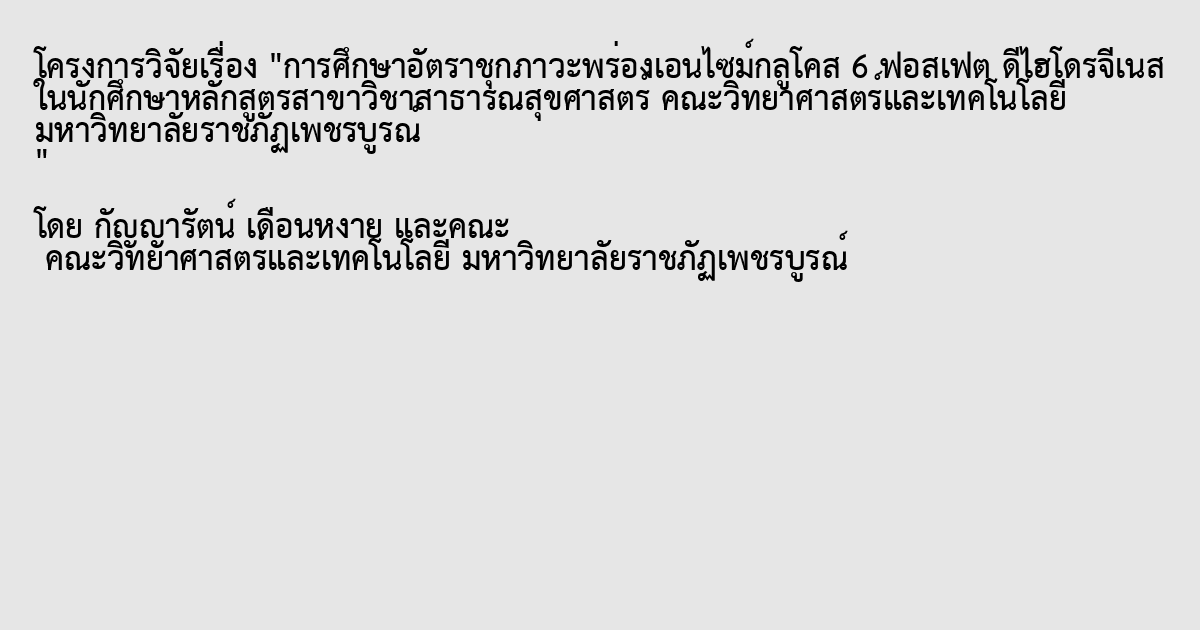 การศึกษาอัตราชุกภาวะพร่องเอนไซม์กลูโคส 6 ฟอสเฟต ดีไฮโดรจีเนส ในนักศึกษาหลักสูตรสาขาวิชาสาธารณสุขศาสตร์ คณะวิทยาศาสตร์และเทคโนโลยี มหาวิทยาลัยราชภัฏเพชรบูรณ์
