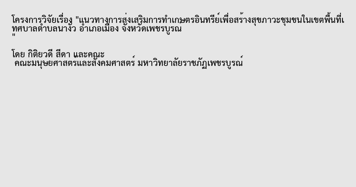 การศึกษาวิจัยนี้ มีวัตถุประสงค์เพื่อศึกษาสถานการณ์การทำเกษตรอินทรีย์ ปัจจัยที่สนับสนุนและปัจจัยที่ เป็นอุปสรรคในการทำเกษตรอินทรีย์ของเกษตรกร รวมไปถึงแนวทางที่จะทำให้เกิดชุมชนต้นแบบการผลิตแบบเกษตร อินทรีย์ในพื้นที่ตำบลนางั่ว อำเภอเมือง จังหวัดเพชรบูรณ์ ใช้ระเบียบวิธีวิจัยเชิงคุณภาพ กลุ่มเป้าหมายในการวิจัย แบ่งเป็นผู้รู้ 3 กลุ่ม ได้แก่ กลุ่มเกษตรกรในพื้นที่ตำบลนางั่วจำนวน 30 คน กลุ่มผู้นำชุมชน ได้แก่ ผู้ใหญ่บ้าน นายกเทศมนตรี สมาชิกสภาเทศบาล และ กลุ่มนักวิชาการ ได้แก่ นักวิชาการด้านสาธารณสุข นักวิชาการเกษตร ครู การศึกษานอกโรงเรียน เป็นต้น โดยมีขั้นตอนการวิจัย ดังนี้ ขั้นตอนที่หนึ่ง ศึกษาข้อมูลบริบทชุมชนด้านการทำ เกษตรอินทรีย์ ด้วยการสัมภาษณ์และสังเกตการณ์แบบมีส่วนร่วม ขั้นตอนที่สอง เชิญวิทยากรให้ความรู้กับเกษตรกร เรื่องเกษตรปลอดภัย เกษตรอินทรีย์ และสุขภาวะของชุมชน ขั้นตอนที่สาม ประชุมระดมสมองแบบมีส่วนร่วมด้วย เทคนิคการสนทนากลุ่ม ขั้นตอนที่สี่ นำข้อมูลมาวิเคราะห์และสรุปผลการวิจัย ขั้นตอนที่ห้า เผยแพร่งานวิจัยเพื่อการ นำไปใช้ประโยชน์