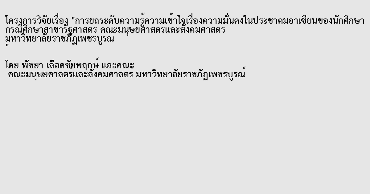 งานวิจัยเป็นงานวิจัยเชิงปริมาณมีวัตถุประสงค์เพื่อศึกษาความรู้ความเข้าใจในประชาคมการเมืองและความมั่นคงอาเซียนของนักศึกษา และเพื่อหาแนวทางยกระดับความรู้ความเข้าใจในประชาคมการเมืองความมั่นคงอาเซียนของนักศึกษาเพื่อเตรียมพร้อมสู่ประชาคมอาเซียนประชากรที่ใช้ในการศึกษาครั้งนี้ ได้แก่ นักศึกษาสาขารัฐศาสตร์ คณะมนุษยศาสตร์และสังคมศาสตร์ มหาวิทยาลัยราชภัฎเพชรบูรณ์ จำนวน 771 คน คน ระยะเวลาในการดำเนินการวิจัยคือ ภาคการศึกษาที่ 1 - 2/2558 เครื่องมือที่ใช้ในการวิจัยครั้งนี้ เป็นแบบทดสอบ จำนวน 100 ข้อคำถาม สถิติที่ใช้ในการวิจัยเป็นสถิติเชิงพรรณนา ผลการวิจัยคือ : 1. ภาพรวมความรู้ความเข้าใจเรื่องความมั่นคงในประชาคมอาเซียนของนักศึกษานั้นอยู่ในระดับ ดีพอใช้ แต่เมื่อพิจารณารายด้านพบว่าด้านที่นักศึกษามีความรู้ความเข้าใจดีที่สุดคือด้านความรู้ความเข้าใจเกี่ยวกับอาเซียนเบื้องต้น ซึ่งอยู่ในระดับดีมาก ด้านวัฒนธรรมการเมืองประชาธิปไตยในอาเซียนเบื้องต้น นักศึกษามีความรู้ความเข้าใจในระดับพอใช้ ด้านความรู้ความเข้าใจเกี่ยวกับประชาคมการเมืองและความมั่นคงอาเซียนเบื้องต้นที่นักศึกษามีความรู้ความเข้าใจในระดับอ่อนมาก และยิ่งความรู้ความเข้าใจในเชิงเทคนิคมากๆอย่าง ด้านความรู้ความเข้าใจเกี่ยวกับบทบาทหน้าที่ของประชาคมการเมืองและความมั่นคงอาเซียน และด้านความรู้ความเข้าใจเกี่ยวกับความมั่นคงเบื้องต้นนั้นนักศึกษาแม้จะมีความรู้ความเข้าใจอยู่แต่ผลคะแนนก็อยู่ในระดับตก เมื่อพิจารณาตัวแปรต้นทุกตัวพบว่า ไม่ว่าจะเป็นเพศ, ชั้นปี, ภาคการศึกษา, และสาขาวิชา ความรู้ความเข้าใจเกี่ยวกับประชาคมการเมืองและความมั่นคงอาเซียนเบื้องต้น บทบาทหน้าที่ของประชาคมการเมืองและความมั่นคงอาเซียน และ ความมั่นคงเบื้องต้น นักศึกษามีความรู้ความเข้าใจในภาพรวมอยู่ในระดับตก ทั้งหมด ส่วนความรู้ความเข้าใจเกี่ยวกับอาเซียนเบื้องต้นถือว่าความรู้ความเข้าใจอยู่ในเกณฑ์พอใช้ 2. ในส่วนกลุ่มความรู้ความเข้าใจ นักศึกษามีความรู้ความเข้าใจเกี่ยวกับอาเซียนเบื้องต้น ดีมาก ด้านวัฒนธรรมการเมืองประชาธิปไตยในอาเซียนเบื้องต้น ดี ด้านความรู้ความเข้าใจเกี่ยวกับประชาคมการเมืองและความมั่นคงอาเซียนเบื้องต้น อ่อนมาก และ ด้านความรู้ความเข้าใจเกี่ยวกับบทบาทหน้าที่ของประชาคมการเมืองและความมั่นคงอาเซียน กับ ด้านความรู้ความเข้าใจเกี่ยวกับความมั่นคงเบื้องต้น อยู่ในระดับตก หมายความว่า ในการจัดการเรียนการสอนนั้นต้องเน้นหนัก ด้านความรู้คว