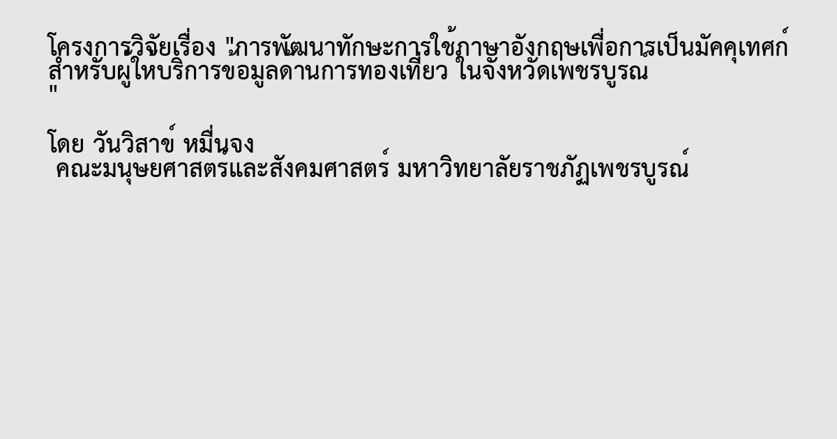 การศึกษาวิจัยครั้งนี้ เพื่อ 1) เพื่อศึกษาปัญหาในการใช้ภาษาอังกฤษเพื่อการเป็น มัคคุเทศก์ ของผู้ให้บริการข้อมูลด้านการท่องเที่ยวในจังหวัดเพชรบูรณ์ 2) เพื่อพัฒนาทักษะ การใช้ภาษาอังกฤษ เพื่อการเป็นมัคคุเทศก์ให้แก่ผู้ให้บริการข้อมูลด้านการท่องเที่ยวในจังหวัด เพชรบูรณ์ 3) เพื่อศึกษา ผลการพัฒนาทักษะการใช้ภาษาอังกฤษเพื่อการเป็นมัคคุเทศก์ของผู้ให้ บริการข้อมูลด้านการ ท่องเที่ยวในจังหวัดเพชรบูรณ์ กลุ่มตัวอย่างที่ใช้ในการศึกษาครั้งนี้ ได้แก่ ผู้ให้บริการด้านการ ท่องเที่ยวในจังหวัดเพชรบูรณ์ จํานวน 40 คน เครื่องมือที่ใช้ในการวิจัยได้แก่ 1) แบบสอบถาม เพื่อศึกษาปัญหาในการใช้ภาษาอังกฤษเพื่อการเป็นมัคคุเทศก์ของผู้ให้บริการ ข้อมูลด้านการ ท่องเที่ยวในจังหวัดเพชรบูรณ์ และ 2)แบบสัมภาษณ์ผลการพัฒนาภาษาอังกฤษ เพื่อการเป็นมัคคุเทศก์ของผู้ให้บริการข้อมูลด้านการท่องเที่ยวในจังหวัดเพชรบูรณ์ ผู้วิจัยวิเคราะห์ ข้อมูลโดยใช้สถิตค่าร้อยละ (Percentage) ค่าเฉลี่ย ( ) และส่วนเบี่ยงเบนมาตรฐาน S.D. ผลการวิจัยพบว่า 1. ผู้ให้บริการข้อมูลด้านการท่องเที่ยวส่วนใหญ่ทำงานในตําแหน่งที่รับผิดชอบ 1-5 ปี และจบการศึกษาระดับต่ำกว่าปริญญาตรี (คิดเป็นร้อยละ 48.00) ให้ข้อมูลนักท่องเที่ยวในแต่ละวัน มากกว่า 10 ราย (คิดเป็นร้อยละ 60.00) และส่วนใหญ่ใช้ภาษาอังกฤษในการให้ข้อมูลแก่ นักท่องเที่ยว (คิดเป็นร้อยละ 82.00) และข้อมูลที่ให้แก่นักท่องเที่ยว ได้แก่ การให้ความรู้แหล่ง ท่องเที่ยวที่ระบุไว้ในโปรแกรมทัวร์ (คิดเป็นร้อยละ 50.00) รองลงมาคือ การกล่าวต้อนรับ นักท่องเที่ยวแนะนําตัวเองและทีมงาน (คิดเป็นร้อยละ 46.00) และการชี้แจงโปรแกรมการท่องเที่ยว ตลอดจนแนะนําการปฏิบัติตน ตามจุดต่างๆ (คิดเป็นร้อยละ 30.00) แต่ทั้งนี้ผู้ให้บริการข้อมูลด้าน การท่องเที่ยวในจังหวัดเพชรบูรณ์ก็ยังมีทักษะการใช้ ภาษาอังกฤษอยู่ในระดับที่ อ่อน (คิดเป็น ร้อยละ 36.00) แต่ส่วนใหญ่เห็นความสําคัญของภาษาอังกฤษ (คิดเป็นร้อยละ 98.00) ส่วนข้อคิดเห็น ในเรื่องของปัญหาในการใช้ภาษาอังกฤษ พบว่า ส่วนใหญ่มีระดับของปัญหาในการใช้ภาษาอังกฤษ เพื่อการเป็นมัคคุเทศก์ในภาพรวม อยู่ในระดับ ปานกลาง ยกเว้นปัญหาในการใช้ภาษาอังกฤษ เนื่องจากการออกเสียงคําศัพท์ของผู้พูด มีระดับของปัญหาในการใช้ภาษาอังกฤษเพื่อการเป็น มัคคุเทศก์ อยู่ในระดับ มาก 2. ภายหลังจากการฝึกภาษาอังกฤษโดยใช้คู่มือการฝึกทักษะภาษาอังกฤษ เพื่อการเป็นมัคคุเทศก์ที่ผู้วิจัยสร้างขึ้น พบว่า คู่มือดังกล่าวเป็นเครื่องมือที่ทำให้ผู้ให้บริการ ด้านการท่องเที่ย