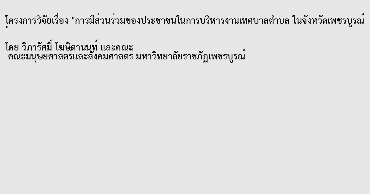The research on “ People’s participation in The Administration of sub-district municipalities in Phetchabun province,” aimed to study a level of people’s participation in the administration of sub-district municipalities in Phetchabun province to compare people’s participation in the administration of sub-district municipalities in Phetchabun province and to study the problems and suggestions of people toward to participation in the administration of sub-district municipalities in Phetchabun province, used the questionnaires in data collection. The sample used in this study was people in 22 sub-district municipalities in Phetchabun province totally 400 persons.