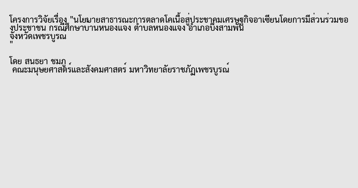 การวิจัยเรื่อง นโยบายสาธารณะการตลาดโคเนื้อสู่ประชาคมเศรษฐกิจอาเซียนโดยการมีส่วนร่วมของประชาชนบ้านหนองแจง ตำบลหนองแจง อำเภอบึงสามพัน จังหวัดเพชรบูรณ์ มีวัตถุประสงค์ 1) เพื่อศึกษาสภาพการผลิตและการตลาดโคเนื้อในบ้านหนองแจง ตำบลหนองแจง อำเภอบึงสามพัน จังหวัดเพชรบูรณ์ 2) เพื่อศึกษาปัจจัยที่ส่งผลต่อนโยบายการตลาดโคเนื้อในบ้านหนองแจง ตำบลหนองแจง อำเภอบึงสามพัน จังหวัดเพชรบูรณ์ 3) เพื่อนำเสนอนโยบายการตลาดโคเนื้อในสู่ประชาคมเศรษฐกิจอาเซียนโดยการมีส่วนร่วมของประชาชน โดยผู้วิจัยศึกษาแบบเชิงปริมาณพื้นที่เป้าหมาย คือ เกษตรกรในพื้นที่หมู่บ้านหนองแจง ตำบลหนองแจง อำเภอบึงสามพัน จังหวัดเพชรบูรณ์ กลุ่มตัวอย่างในการศึกษา จำนวน 377 คน ได้มาจากการสุ่มตัวอย่างโดยการเปิดตารางของเคซี่ มอแกน การเก็บรวบรวมข้อมูลและแบบสอบถาม ซึ่งเป็นประเภทมาตราส่วนประมาณค่า 5 ระดับ การวิเคราะห์ข้อมูล ใช้สถิติ ร้อยละ (Percentage) ค่าเฉลี่ย (Mean : ) และค่าเบี่ยงเบนมาตรฐาน (Standard Deviation) การวิเคราะห์ความถดถอยพหุคูณตามลำดับความสำคัญของตัวแปรที่เข้าสมการ (Enter Multiple Regression Analysis) โดยใช้การวิจัยเชิงพรรณนา (Descriptive Research)