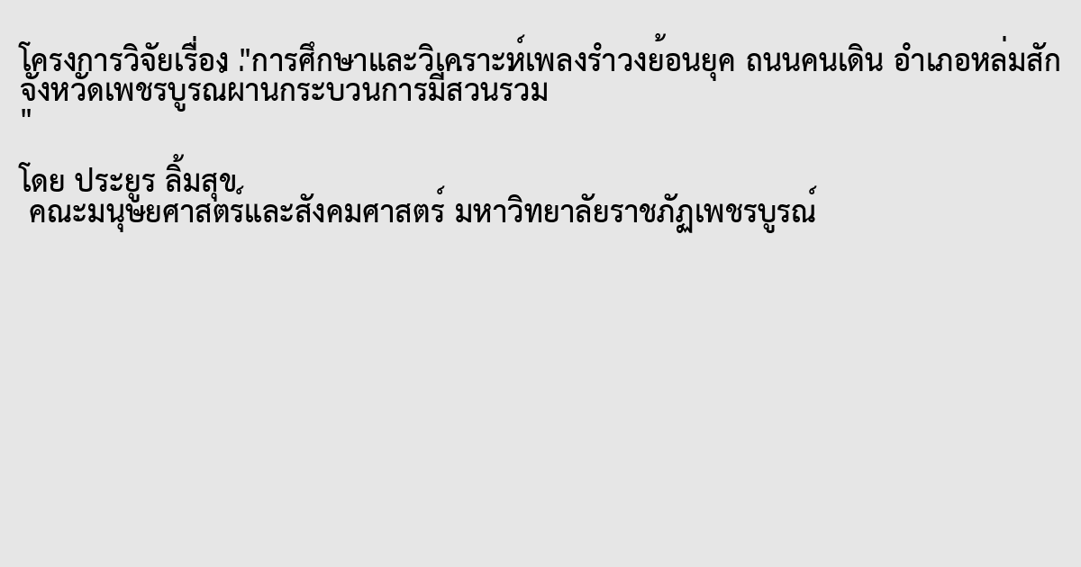 การศึกษาและวิเคราะห์เพลงรำวงย้อนยุค,ถนนคนเดิน อำเภอหล่มสัก จังหวัดเพชรบูรณ์,กระบวนการมีส่วนร่วม,The study and analysis of Ramwong dance music,Walking Street Lom Sak District Phetchabun,The participatory process