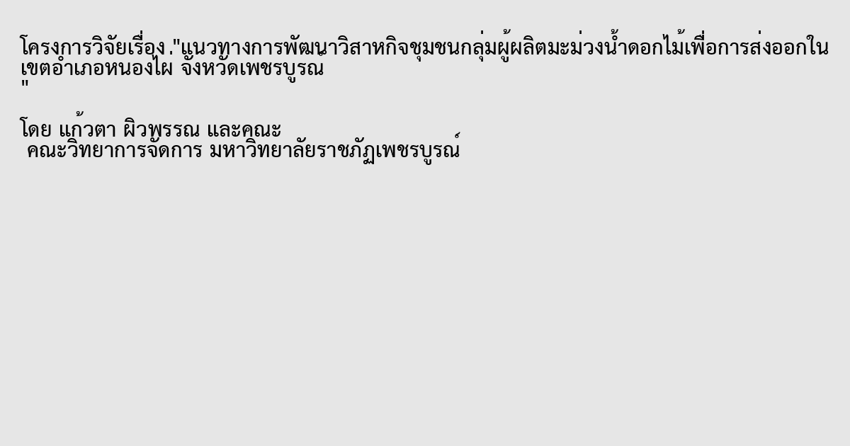 The level of operational management of the Group of Small and Micro Community Enterprises Barracuda mango for export in the County Nong phai district Phetchabun with administrative high level overall ( X = 3.76 ) and split a side list, find that administrative, on many levels ( X = 4.10) Operations on many levels ( X = 3.87 ) total production level is very ( X =3.72) a marketing medium ( X =3.37) Finance on many levels ( X = 3.70) on the participation of members in the group on many levels ( X = 3.83 ) on the news, information, and technology on many levels ( X = 3.75).