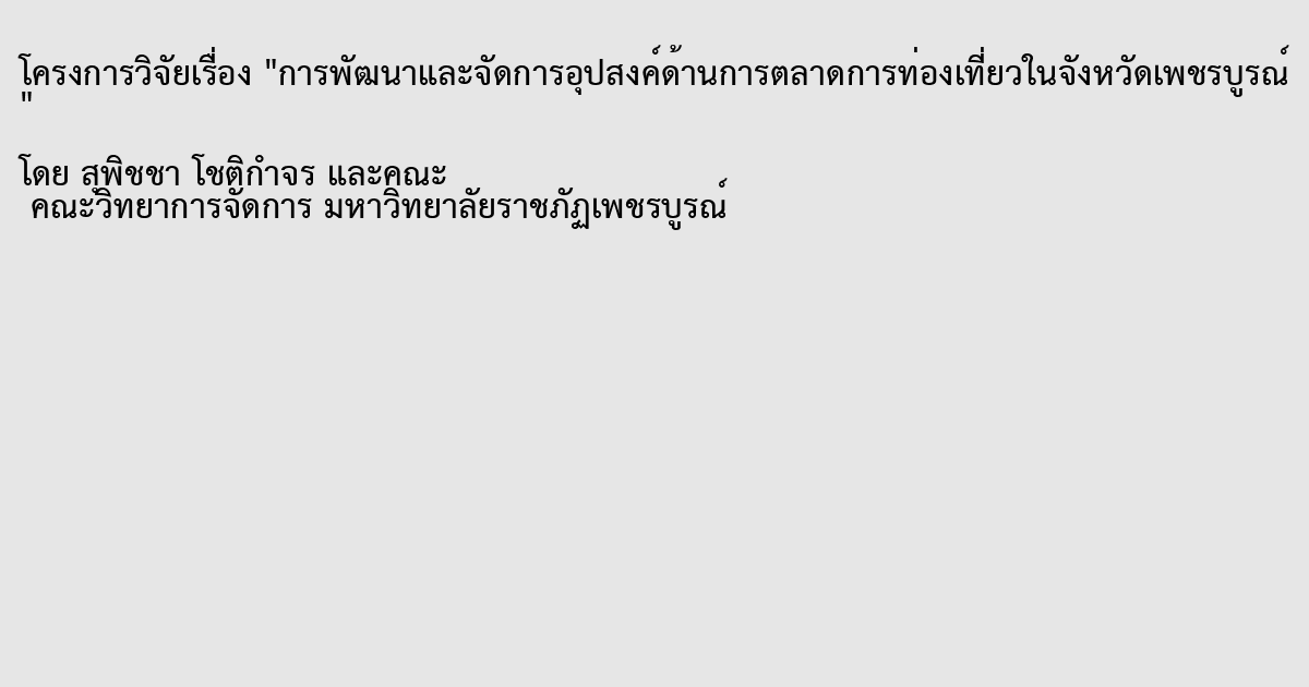 On study to the development of the tourism market in Phetchabun province, the findings reveal that there should be a channel for disseminating information to promote tourism, develop a media tourism to be effective and knowledge and skills about tourism, in addition, there should organizing accommodation, traffic problems, and garbage problems. To create a good image of tourism to Phetchabun province.