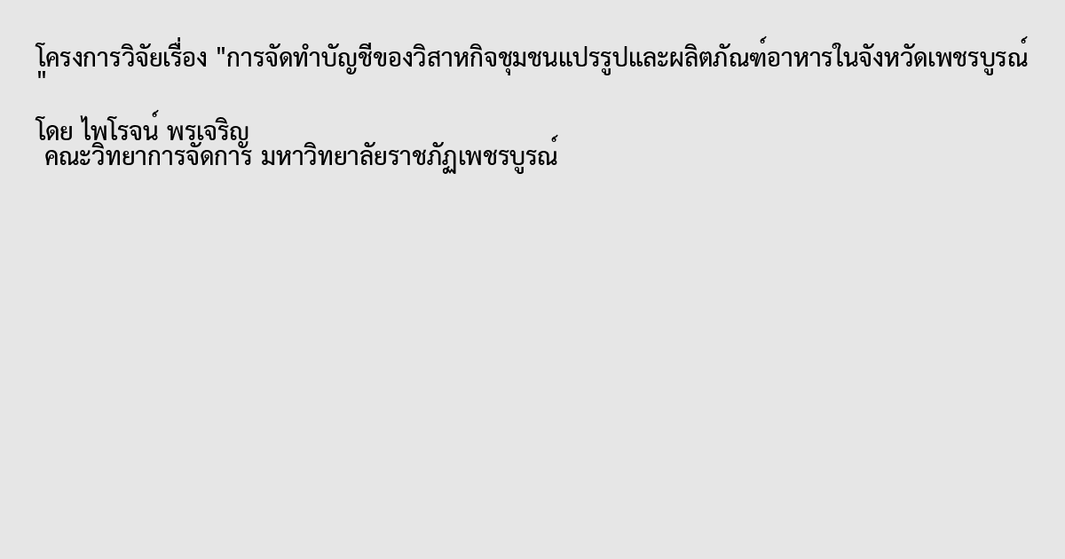 งานวิจัยนี้นำเสนอการจัดทำบัญชีของวิสาหกิจชุมชนแปรรูปและผลิตภัณฑ์อาหารในจังหวัดเพชรบูรณ์ โดยมีวัตถุประสงค์ 1) เพื่อศึกษาแนวปฏิบัติ และสภาพของการจัดทำบัญชีของวิสาหกิจชุมชนแปรรูปและผลิตภัณฑ์อาหารในจังหวัดเพชรบูรณ์ 2) เพื่อศึกษาปัญหาและอุปสรรคในการจัดทำบัญชีของวิสาหกิจชุมชนแปรรูปและผลิตภัณฑ์อาหารในจังหวัดเพชรบูรณ์