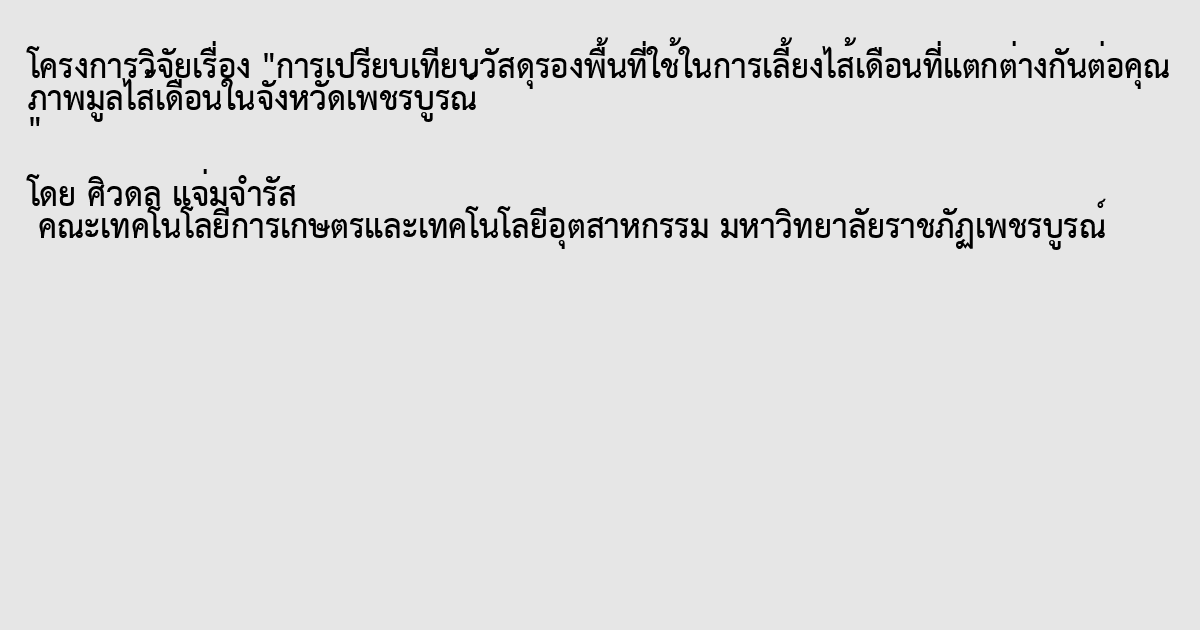 งานวิจัยครั้งนี้ มีวัตถุประสงค์เพื่อศึกษาเปรียบเทียบคุณภาพของมูลไส้เดือนที่ใช้วัสดุรองพื้นที่แตกต่างกันในการเลี้ยงไส้เดือน ทาการวางแผนการทดลองโดยใช้แผนการทดลองแบบบล็อกสมบูรณ์ กาหนดให้วัสดุรองพื้นเป็นบล็อก มีทั้งหมด 3 บล็อก ประกอบด้วย วัสดุรองพื้นที่เป็นมูลโค มูลสุกร และมูลไก่ ตามลาดับ และกาหนดให้การเสริมอาหารที่เป็นแหล่งพลังงานและโปรตีนต่างๆ ให้กับไส้เดือนเป็นปัจจัย มีทั้งหมด 4 ปัจจัยคือ ไม่เสริมอาหาร เสริมข้าวโพดบด เสริมราละเอียด และเสริมกากถั่วเหลือง ทาการทดลองซ้าทั้งหมด 4 ซ้า และทดลองเลี้ยงไส้เดือนเป็นระยะเวลา 6 สัปดาห์ ทาการสุ่มเก็บมูลไส้เดือนเพื่อนาไปวิเคราะห์คุณภาพมูลไส้เดือนทั้งหมด