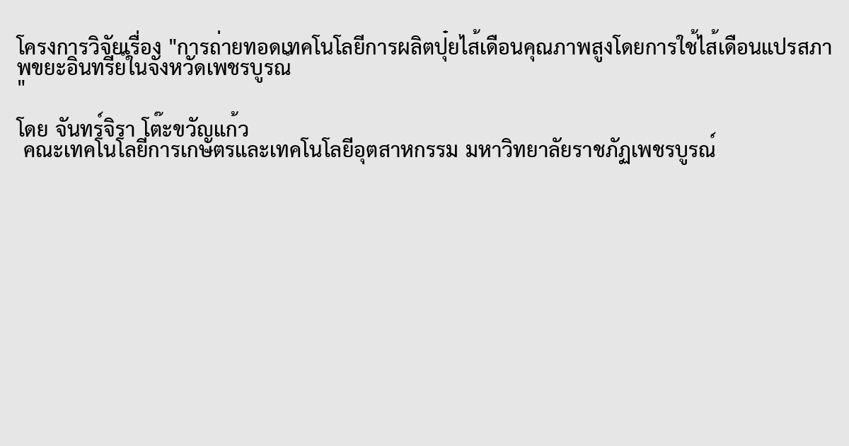 The aims of this research were to get rid of the organic waste by earthworms production propagation and created an earthworms network society in this research‘s community to sustainable. Studying the basic control and disposal waste of community groups, gather knowledge to control and reduce pollution, the use of earthworms to convert organic waste. Meetings to analyze, synthesize organic waste for proper engagement, evaluation and summary of practicality in this community and preparation of the learning center. The results of this project activities, high quality vermicompost fertilizer using earthworms transform organic waste in Phetchabun. province propagation technology can be added value from organic waste using earthworms and treated as vermicompost organic fertilizer which is of high quality and can be related to the agricultural chemical-free farming. Communities can produce vermicompost fertilizer for agricultural use. Reduce costs and generate revenue. Impact on reducing waste, both household and community sustainability. Including the propagation knowledge for other communities by the learning center. Keywords: Vermicompost, organic waste, propagation