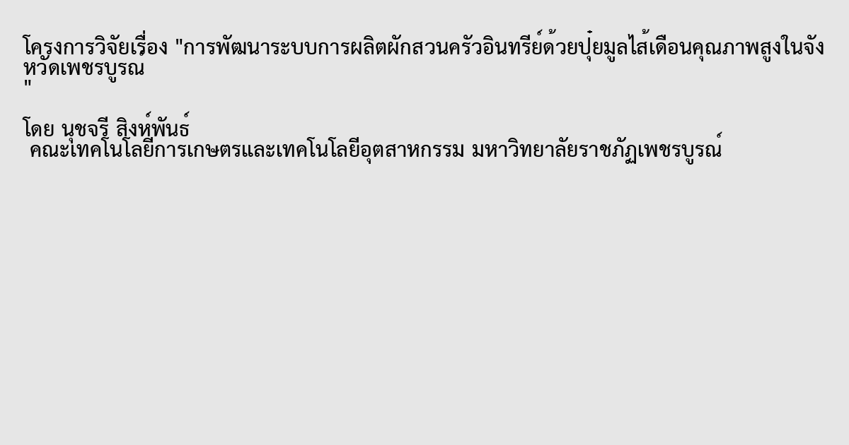 งานวิจัยครั้งนี้มีวัตถุประสงค์เพื่อศึกษาผลของปุ๋ยมูลไส้เดือนที่มีผลต่อการเจริญเติบโตและผลผลิตของผักสวนครัว ได้แก่ ผักชี มะเขือเปราะ ผักบุ้ง ถั่วฝักยาว ต้นหอม โหระพา พริกจินดา แตงกวา และคะน้าที่เพาะปลูกในสภาพโรงเรือน โดยผสมปุ๋ยมูลไส้เดือนในดินผสมพร้อมปลูกในอัตราส่วนที่แตกต่างกัน 4 ระดับ คือ 0 10 20 และ 30 เปอร์เซ็นต์ บันทึกการเจริญเติบโตทางด้านจานวนใบ ความกว้างใบ ความยาวใบ ความสูงลาต้น ความกว้างทรงพุ่ม ความเข้มสีใบ จานวนดอกต้นต้น ความยาวผล น้าหนักผลสด น้าหนักผลแห้ง เปอร์เซ็นต์ความชื้น เปอร์เซ็นต์น้าหนักวัตถุแห้ง จานวนผลต่อต้น และผลผลิตต่อไร่ จากการทดลองพบว่าประสิทธิภาพของปุ๋ยมูลไส้เดือนส่งผลให้การเจริญเติบโตและผลผลิตของผักชี มะเขือเปราะ ผักบุ้ง ถั่วฝักยาว ต้นหอม โหระพา พริกจินดา แตงกวา และคะน้ามากกว่าชุดควบคุม ทั้งนี้การผสมปุ๋ยมูลไส้เดือนอัตราส่วน 20 เปอร์เซ็นต์ในการปลูกผักบุ้ง ถั่วฝักยาว และแตงกวาในดินที่ส่งผลให้การเจริญเติบโตและผลผลิตมากที่สุด ในขณะที่การผสมปุ๋ยมูลไส้เดือนอัตราส่วน 30 เปอร์เซ็นต์ในการปลูกการปลูกผักชี มะเขือเปราะ ต้นหอม โหระพา พริกจินดา และคะน้าในดินที่ส่งผลให้การเจริญเติบโตและผลผลิตมากที่สุด