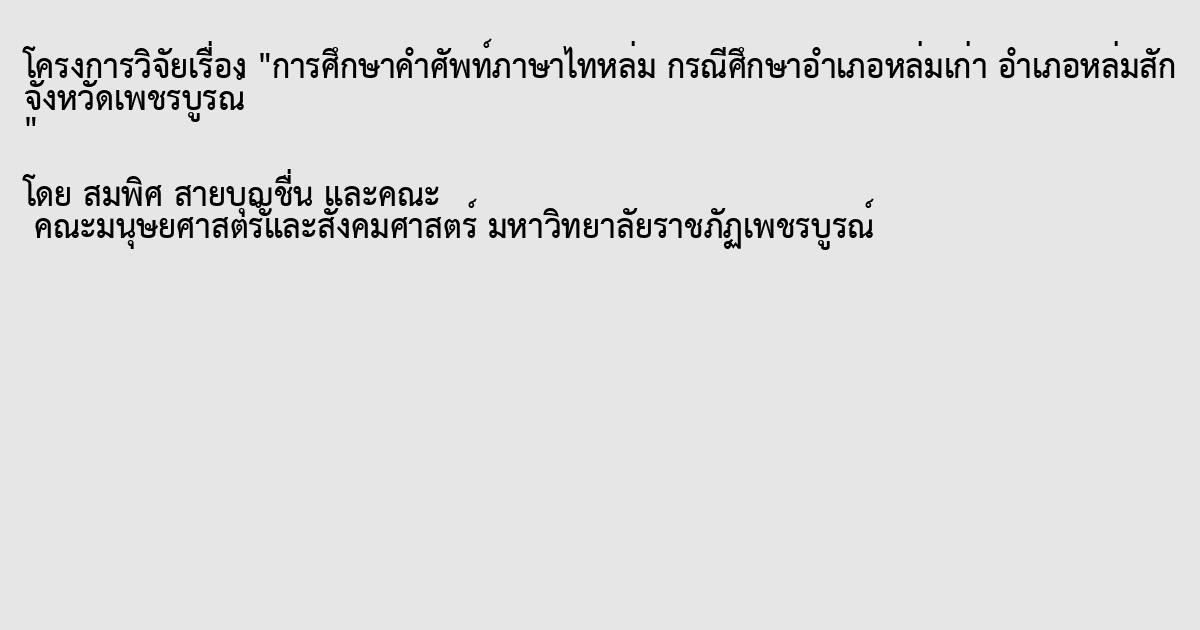 2. The accent of Lom dialect in both districts was merely distinct on some words without different meanings, for example, ‘Boed’ by Lomsak accentual word and ‘Hmoed’ by Lomkao accentual word in the similar meaning of ‘Run Out’, and ‘Hua Khi Khai’ by Lomsak accentual word and ‘Hua Si Khai’ by Lomkao accentual word in the similar meaning of ‘Lemongrass.’ In fact, their accents were originally influenced by Luangprabang and Vientian, Laos: these two accents – most people speaking Lom dialect with Luangprabang accent live in Lomsak town, and those speaking Lom dialect with Vientian accent live in Tiew village, Lomsak; meanwhile, people in Lomkao obviously speak Lom dialect with Luangprabang accent.