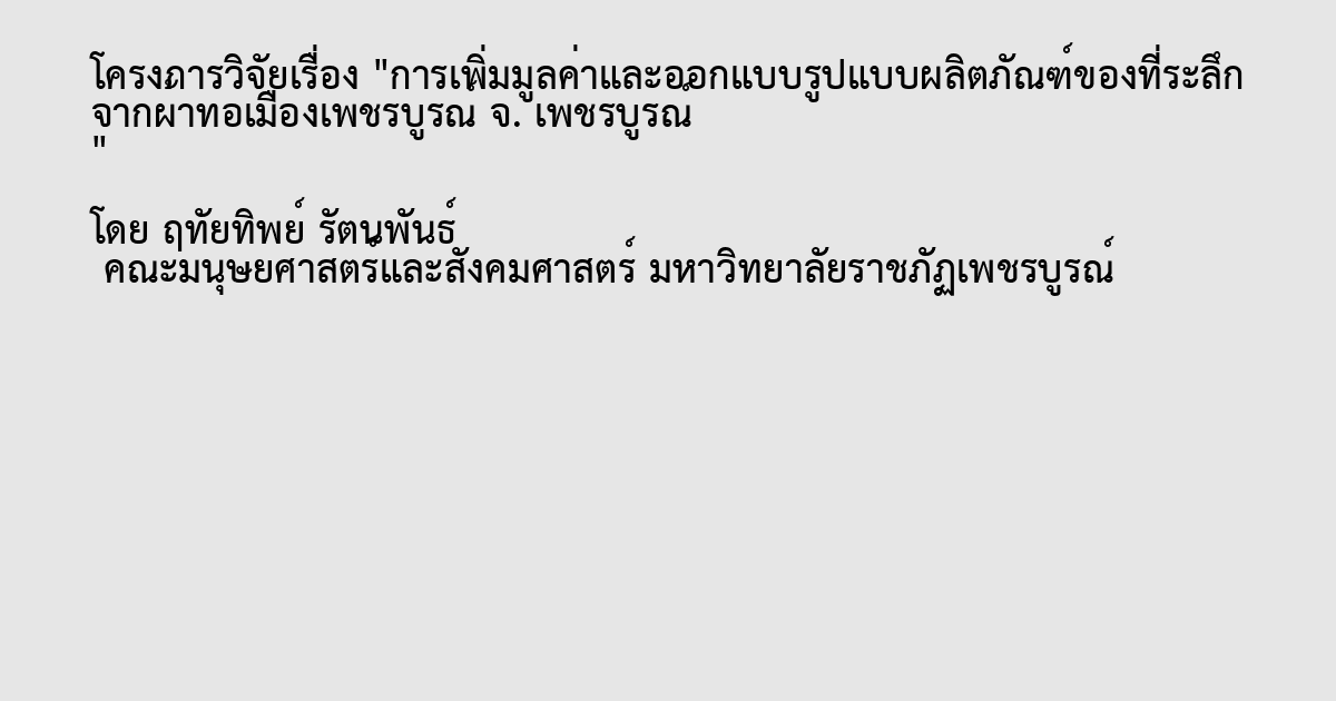 I have the impression the design pattern, which has interests ranging from information age-long history. Along with the evolution of humans since prehistory since prehistory. The combat collection in the living area, the scramble. Hunting to find food out when living as fear in the horrible. To find what causes the bond that will create a strong spirit, ready to face these things. Thus causing the creative works of art came up with the purpose of designing the pattern fabric from the local culture of the phetchabun province. To create a product, the execution of works from the pattern and fabric for a template, if you are interested in the profession. To embroider the cloth of this data-inspired culture and way of life, phetchabun province. My view, it is a fertile area, phetchabun province, surrounded by mountains. Good weather and natural beauty. Alternatives the source to learn the old cultural tradition and way of life of the people who have the peacefulness. Therefore a unique fantasy can be drawn up into a pattern that represents the vernacular blend. This kit works objectives and concepts I can create something that convey unique to phetchabun and in furtherance of those interested.