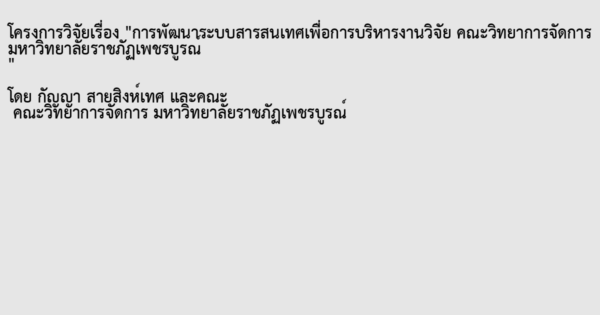 งานวิจัยในครั้งนี่มจุดมุ่งหมายเพื่อให้มีระบบสารสนเทศสำหรับการบริหารจัดการข้อมูลด้าน งานวิจัยเพื่อให้ผู้บริหารสามารถตัดสินใจและวางแผนในด้านการพัฒนางานวิจัยและบุคลากรภายในคณะ ซึ่งระบบสารสนเทศนี้จะสามารถสรุปจำนวนงานวิจัย เปรียบเทียบงบประมาณทุนวิจัยของแต่ละสาขาวิชาภายในคณะ อีกทั้งยังสามารถค้นหางานวิจัยของนักวิจัยในคณะ และนำเสนอในรูปแบบ กราฟ เพื่อให้สะดวกต่อการเรียกดู และการรายงานต่อผู้บริหารได้ง่ายขึ้น และจากการประเมินความพึงพอใจในภาพรวมนั้น อยู่ในระดับความพึงพอใจมากที่สุด