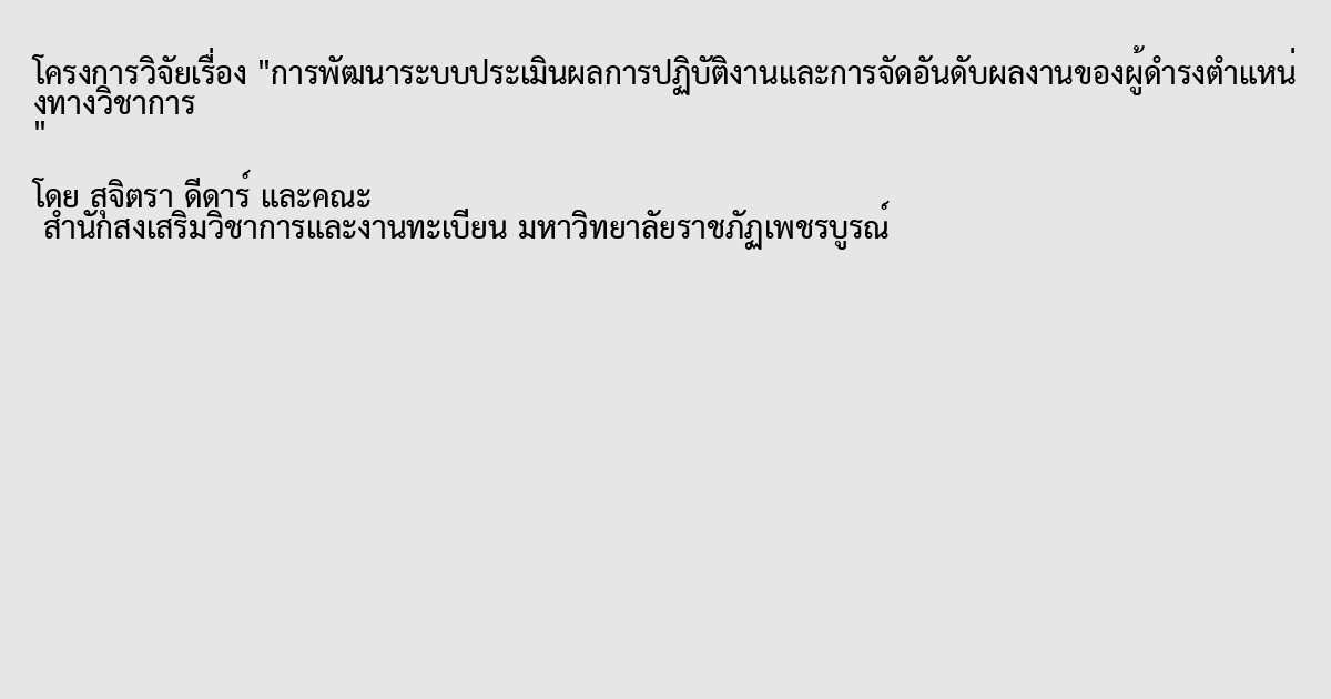 The development of performance evaluation system and ranging of the academic worker focused on an automatics evaluation system of the Rajabath Phetchabun University for the academic worker. The study objective was for develop the performance evaluation system of the Rajabath Phetchabun University.
