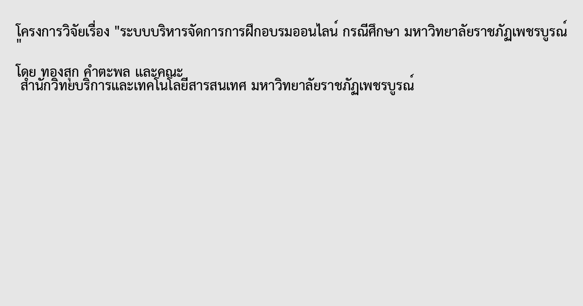 The purposes of this research were to develop the Management training online system for Phetchabun Rajabhat University. By collected data from the problems and needs of the user and developed to a Web Application. The system was developed using System Development Life Cycle (SDLC), Apache as Web Server, developed application with PHP and MySQL. The research found that, the Online Training Management System had the efficient operation of the system is in a excellent level (4.59 average and standard deviation is 0.66) and system designing is also in a good level (4.47 average and standard deviation is 0.69). Therefore, the Online Training Management System can be conclude the assessment of satisfaction of the participants and can be used as a channel of communication between the project and the participants as well.
