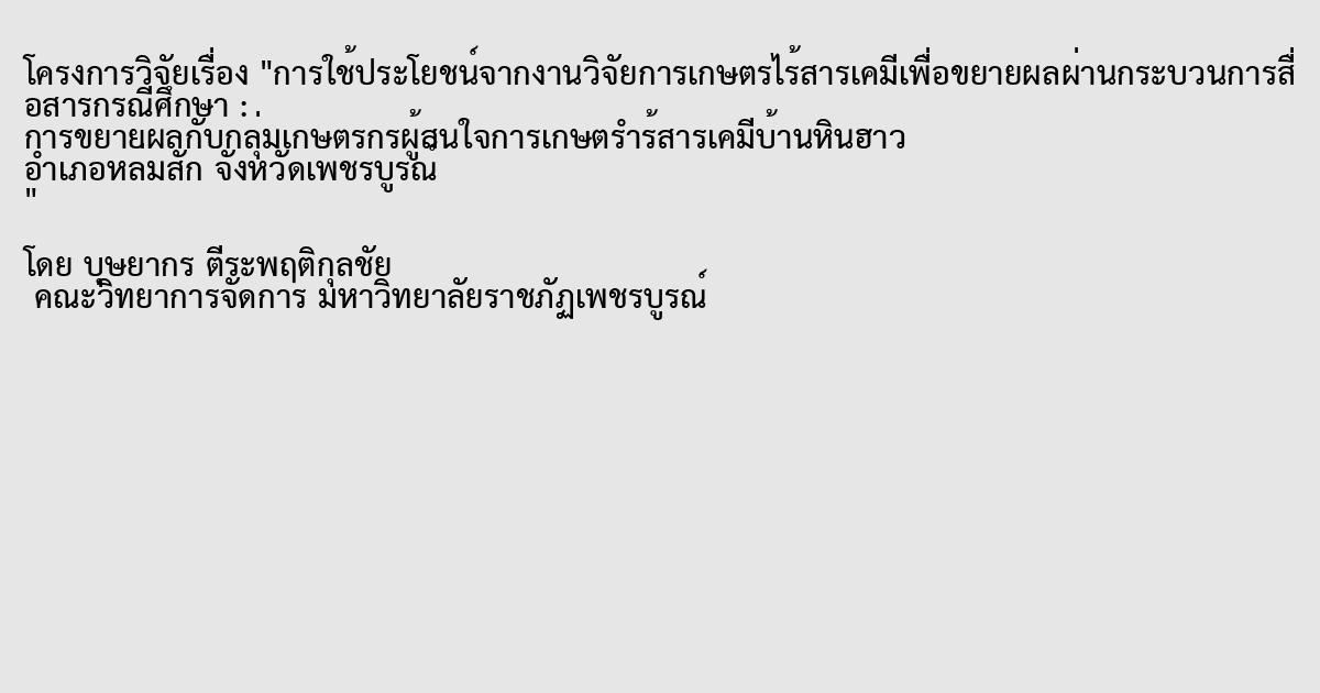 การใช้ประโยชน์จากงานวิจัยการเกษตรไร้สารเคมีเพื่อขยายผลผ่านกระบวนการสื่อสารกรณีศึกษา : การขยายผลกับกลุ่มเกษตรกรผู้สนใจการเกษตรำร้สารเคมีบ้านหินฮาว อำเภอหล่มสัก จังหวัดเพชรบูรณ์