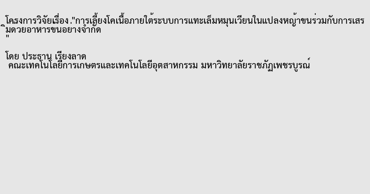 การศึกษาการเลี้ยงโคเนื้อภายใต้ระบบการแถเลยหมุนเวียนในแปลงหญ้าขนร่วมกับการเสริมด้วยอาหารข้นอย่างจำกัดในระหว่างเดือนมิถุนายน 2551 ถึงเดือน กันยายน 2551 ในพื้นที่แปลงหญ้าขนบริเวณมหาวิทยาลัยราชภัฎเพชรบูรณ์ แปลงหญ้าขนพื้นที่ 6 ไร่ แบ่งแปลงย่อยขนาด 1 ไร่จำนวน 6 แปลงย่อย ใช้แผนการทดลองแบบ RCBD โดยใช้คนเนื้อเพศผู้ไม่ตอนพันธุ์ลูกผสมบราห์มัน x ฮินดูบราซิล อายุประมาณ1 ปีจำนวน 6 ตัวแบ่งออกเป็น 2 กลุ่ม กลุ่มละ 3 ตัวประกอบด้วย 2 ทรีทเมนท์ 1) แทะเล็มหญ้าขนหมุนเวียนร่วมกับอาหารข้น 0% 2) แทะเล็มหญ้าขนหมุนเวียนร่วมกับเสริมอาหารข้น 0.5% ของน้ำหนักตัว บำรุงรักษาแปลงหญ้าขนภายหลังการแทะเล็มโดยการใส่ปุ๋ยยูเรีย สูตร 46-0-0 จำนวน 10 กิโลกรัมต่อไร่ต่อรอบการแทะเล็มเมื่อดินมีความชื้นเพียงพอ