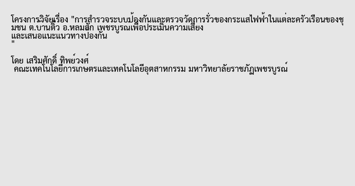 การสำรวจระบบป้องกันและตรวจวัดการรั่วของกระแสไฟฟ้าในแต่ละครัวเรือนของชุมชน ต.บ้านติ้ว อ.หล่มสัก เพชรบูรณ์เพื่อประเมินความเสี่ยง และเสนอแนะแนวทางป้องกัน