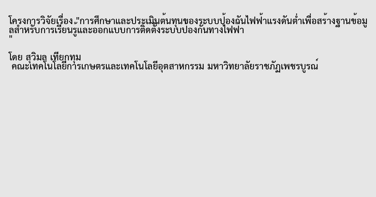 งานวิจัยนี้ได้ทำการศึกษาและประเมินต้นทุนของระบบไฟฟ้าแรงดันต่ำเพื่อสร้างฐานข้อมูลสำหรับการเรียนรู้และออกแบบการติดตั้งระบบป้องกันทางไฟฟ้า โดยข้อมูลราคาเหล่านี้มีส่วนสาคัญเป็นอย่างยิ่งในการเลือกใช้อุปกรณ์รองจากคุณสมบัติการทำงานและคุณภาพของอุปกรณ์เหล่านั้นซึ่งวัตถุประสงค์ของการศึกษาวิจัยนี้ อันดับแรกเพื่อศึกษาระบบและอุปกรณ์ป้องกันไฟฟ้าแรงดันต่ำเพื่อสร้างฐานข้อมูลสำหรับการเรียนรู้และออกแบบระบบป้องกันทางไฟฟ้า อันดับสองเพื่อประเมินต้นทุนของระบบและอุปกรณ์ป้องกันไฟฟ้าแรงดันต่ำ อันดับสุดท้ายเพื่อจัดการองค์ความรู้ด้านวิศวกรรมและผลการประเมินต้นทุนระบบป้องกันไฟฟ้าแรงดันต่ำสู่ชุมชนเพื่อเป็นชุมชนต้นแบบในการพัฒนาและยกระดับความปลอดภัยด้านไฟฟ้า ซึ่งผลในการศึกษาวิจัยการประเมินราคาในการติดตั้งวัสดุอุปกรณ์ไฟฟ้าจะอ้างอิงราคาติดตั้งมาตรฐาน ซึ่งข้อมูลในการศึกษาและประเมินต้นทุนของระบบป้องกันไฟฟ้าแรงดันต่ำนี้สามารถใช้เป็นฐานข้อมูลสำหรับการเรียนรู้เพื่อประเมินการออกแบบระบบป้องกันทางไฟฟ้าได้