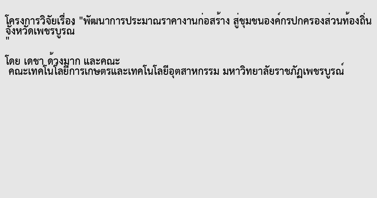 งานวิจัยนี้ เป็นงานวิจัยประเภทเพื่อสร้างสะสมองค์ความรู้ มีจุดประสงค์ 1) เพื่อศึกษาสำรวจ ความต้องการพัฒนาการประมาณราคางานก่อสร้าง ของชุมชนองค์กรปกครองส่วนท้องถิ่น จังหวัดเพชรบูรณ์ 2) เพื่อพัฒนาและหาประสิทธิภาพ หลักสูตรการจัดอบรมการประมาณราคางานก่อสร้าง สู่ชุมชนองค์กรปกครองส่วนท้องถิ่น จังหวัดเพชรบูรณ์ และ 3) ศึกษาความพึงพอใจเข้าร่วมโครงการวิจัย พัฒนาการประมาณราคางานก่อสร้าง สู่องค์กรปกครองส่วนท้องถิ่น และบุคคลที่สนใจ จังหวัดเพชรบูรณ์ ข้อมูลขั้นพื้นฐานจากการสำรวจข้อมูลขั้นพื้นฐาน บุคลากรฝ่ายกองช่าง องค์กรปกครองส่วนท้องถิ่น จังหวัดเพชรบูรณ์ การประมาณราคาก่อสร้าง เพื่อนำข้อมูลมาพัฒนา การประมาณราคางานก่อสร้าง พบว่า จากประเด็นทั้งหมด 3 ด้าน 9 รายการโดยภาพรวมอยู่ในระดับมาก มีค่าเฉลี่ยเท่ากับ 3.11 ผลประสิทธิภาพหลักสูตรและประสิทธิผลการเรียนรู้ จากใช้หลักสูตรการพัฒนาการประมาณราคางานก่อสร้าง จำนวน 30 คน จะเห็นได้ว่าประสิทธิภาพของผู้เรียนจากการจัดอบรมเชิงปฏิบัติการ มีประสิทธิภาพระหว่างกระบวนการ ของหน่วยการเรียนที่ 1 2 และ 3 เท่ากับ 85.60 85.20 และ 85.73 ตามลำดับ และประสิทธิภาพของหลักสูตร (E1/E2) เท่ากับ 85.51/85.73 ซึ่งมากกว่าเกณฑ์ที่กำหนดไว้ที่ 80/80