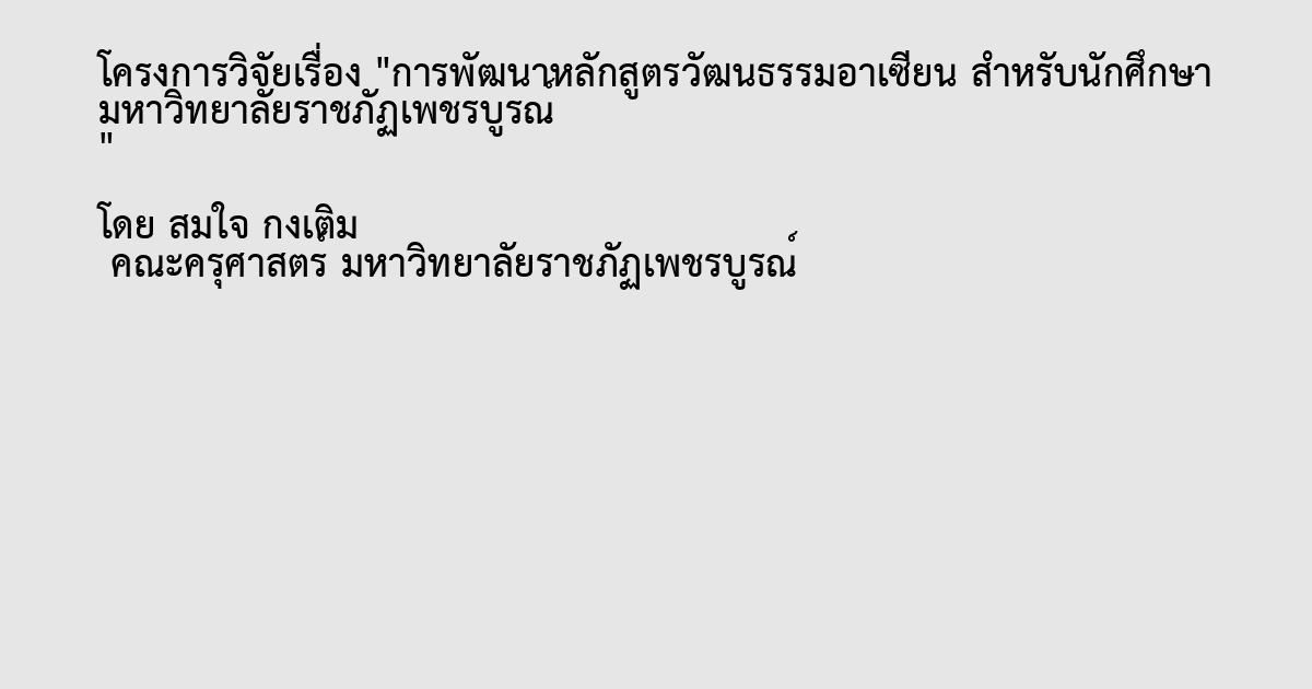 การวิจัยในครั้งนี้มีวัตถุประสงค์เพื่อ 1)ศึกษาข้อมูลพื้นฐานด้านวัฒนธรรมอาเซียนของนักศึกษามหาวิทยาลัยราชภัฏเพชรบูรณ์ 2)เพื่อสร้างและตรวจสอบคุณภาพของหลักสูตรวัฒนธรรมอาเซียน 3)เพื่อทดลองใช้หลักสูตรวัฒนธรรมอาเซียน 4)ประเมินความพึงพอใจของนักศึกษามหาวิทยาลัยราชภัฏเพชรบูรณ์ที่ใช้หลักสูตรวัฒนธรรมอาเซียน
