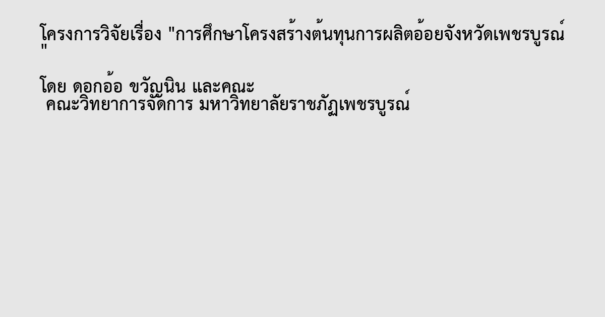 การวิจัยครั้งนี้มีวัตถุประสงค์ เพื่อศึกษาถึงต้นทุนการผลิตอ้อยของเกษตรกรจังหวัดเพชรบูรณ์ ได้ทาการรวบรวมข้อมูลจากกลุ่มตัวอย่างที่ใช้ในการวิจัยครั้งนี้ คือ กลุ่มเกษตรกรชาวไร่อ้อยจังหวัดเพชรบูรณ์ โดยทาการเลือกกลุ่มตัวอย่างในครั้งนี้ โดยวิธีการสุ่มตัวอย่างแบบแบ่งชั้นตามสัดส่วน จานวน 387 คน และนามาวิเคราะห์ภาพรวมในเชิงพรรณนา