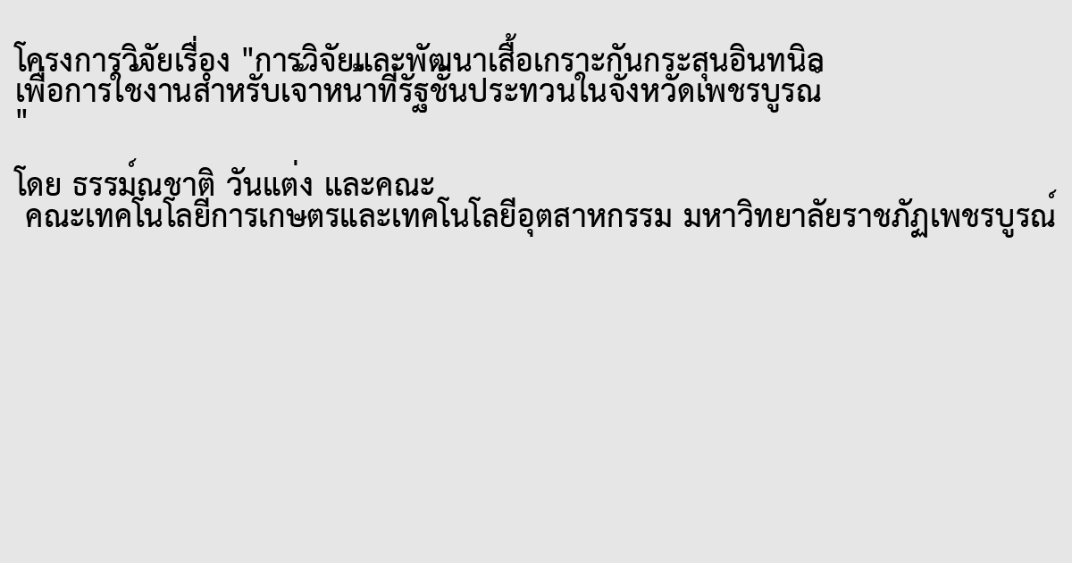 และการถ่ายทอดเทคโนโลยีการผลิตเสื้อเกราะกันกระสุนอินทนิลสำหรับเจ้าหน้าที่รัฐชั้นประทวนในจังหวัดเพชรบูรณ์ ผลการวิจัยพบว่า ผลสัมฤทธิ์ทางการเรียนก่อนและหลังเรียนของผู้เข้าร่วมกิจกรรมการถ่ายทอดเทคโนโลยีการผลิตเสื้อเกราะกันกระสุนอินทนิลแตกต่างกันอย่างมีนัยสำคัญทางสถิติที่ระดับ 0.05 แสดงให้เห็นว่ากิจกรรมการฝึกอบรมดังกล่าวมีผลทำให้ผู้เข้าร่วมกิจกรรมถ่ายทอดเทคโนโลยีการผลิตเสื้อเกราะกันกระสุนอินทนิล ดังกล่าวมีความรู้เพิ่มขึ้นส่วนผลความพึงพอใจต่อกิจกรรมการถ่ายทอดเทคโนโลยีการผลิตเสื้อเกราะกันกระสุนอินทนิลสำหรับเจ้าหน้าที่รัฐชั้นประทวนในจังหวัดเพชรบูรณ์ ในภาพรวมมีค่าเฉลี่ยรวมเท่ากับ 4.45 ค่าส่วนเบี่ยงเบนมาตรฐานเท่ากับ 0.60 ระดับความพึงพอใจ อยู่ในเกณฑ์มากหรือดี