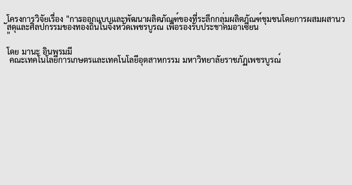 งานวิจัยนี้มีวัตถุประสงค์ เพื่อส่งเสริมและสนับสนุนกลุ่มผลิตภัณฑ์ที่มีการดำเนินกิจกรรมอยู่แล้วได้พัฒนารูปแบบผลิตภัณฑ์ ทำบรรจุภัณฑ์ที่มีเอกลักษณ์ของท้องถิ่นโดยการผสมผสานวัสดุที่เป็นมิตรกับสิ่งแวดล้อมและศิลปกรรมในจังหวัดเพชรบูรณ์เพื่อรองรับประชาคมอาเซียน ประชากรที่ใช้ในการศึกษา ได้แก่ สมาชิกกลุ่มผลิตภัณฑ์งานไม้ อำเภอบึงสามพัน จังหวัดเพชรบูรณ์ กลุ่มผลิตภัณฑ์ งานแกะสลักเขาโค กระบือ อำเภอบึงสามพัน จังหวัดเพชรบูรณ์ กลุ่มผลิตภัณฑ์ งานประดิษฐ์เศษวัสดุเหลือใช้ อำเภอหนองไผ่ จังหวัดเพชรบูรณ์ และกลุ่มผลิตภัณฑ์ งานดินเผา (อิฐมอญ) อำเภอเมือง จังหวัดเพชรบูรณ์ ซึ่งจากผลการวิจัยพบว่า จากการศึกษาบริบทชุมชนและการสำรวจความคิดเห็นของชุมชนพบว่าควรที่จะออกแบบพัฒนาและสร้างต้นแบบผลิตภัณฑ์ชุมชน กลุ่มผลิตภัณฑ์งานไม้ งานแกะสลักเขาโค กระบือ งานประดิษฐ์เศษวัสดุเหลือใช้ งานดินเผาเป็นของที่ระลึกสิ่งประดับตกแต่ง เป็นแจกัน กรอบรูป พวงกุญแจ โคมไฟฟ้า รูปนูนต่ำ ม่าน มูลี่ โมบาย เชิงเทียน โดยผสมผสานงานศิลปกรรมกับวัสดุท้องถิ่น โดยใช้วัสดุที่เป็นมิตรกับสิ่งแวดล้อมได้แก่ ดินเหนียวท้องนา ซากเขาโค, กระบือ เศษไม้เบญจพรรณ ต้นเปลือกและซังข้าวโพด โดยต้นแบบผลิตภัณฑ์ของที่ระลึกที่ใช้แนวคิดจากองค์พระพุทธมหาธรรมราชาและศิลปกรรมเมืองศรีเทพ เป็นต้นแบบที่ได้ผลการประเมินการออกแบบจากผู้ประกอบการและนักท่องเที่ยว โดยภาพรวมทุกด้านมีความเหมาะสมดี สามารถนำต้นแบบไปผลิตขายเพื่อสร้างรายได้ให้กับชุมชนได้ในอนาคต โดยการนำเอาอัตลักษณ์และเอกลักษณ์ของจังหวัดมาใช้ให้เป็นประโยชน์