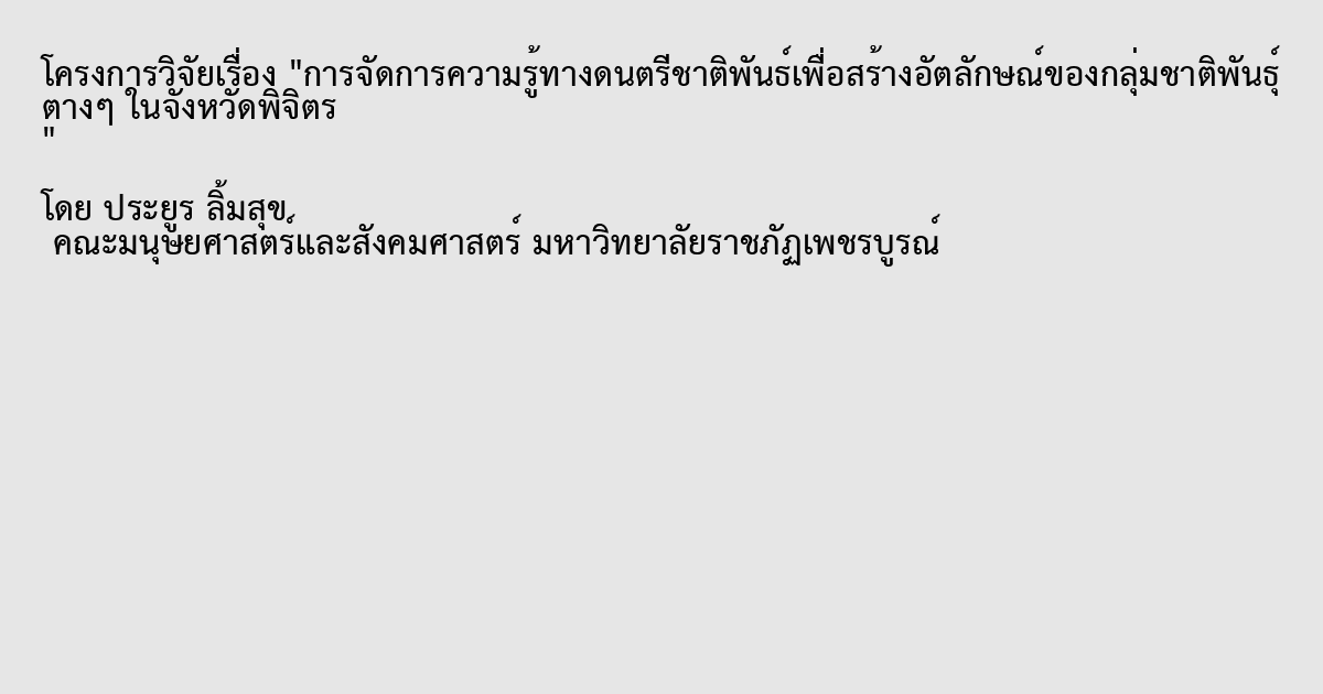 งานวิจัยนี้มีวัตถุประสงค์เพื่อการจัดการความรู้ทางดนตรีเชิงชาติพันธุ์เพื่อสร้างอัตลักษณ์ของกลุ่มชาติพันธุ์ต่างๆ ในจังหวัดพิจิตร โดยผ่านการวิจัยเชิงปฏิบัติการแบบมีส่วนร่วมเพื่อเป็นแหล่งของการศึกษา เรียนรู้ ฟื้นฟูดนตรีและวัฒนธรรมของกลุ่มชาติพันธุ์ต่างๆ ในลักษณะการเรียนรู้แบบพหุภาคี การวิจัยนี้เป็นการวิจัยเชิงคุณภาพ โดยใช้ระเบียบวิธีวิจัยเชิงปฏิบัติการแบบมีส่วนร่วม ประชากรที่ใช้ในการศึกษา ได้แก่ ชาวพื้นถิ่น ชาวไทยกูย ชาวไทยมุสลิม ชาวลาวแง้ว ชาวไทยยวน ชาวไทยเชื้อสายจีน ชาวไทยทรงดำ ชาวไทยอีสาน ชาวลาวพวน ชาวลาวครั่ง ตามกรอบแนวคิดการวิจัยว่าด้วยกระบวนการจัดการความรู้ทั้ง 7 ขั้นตอน ได้แก่ การค้นหาความรู้ การสร้างและแสวงหาความรู้ การจัดความรู้ให้เป็นระบบ การประมวลและกลั่นกรองความรู้ การเข้าถึงความรู้ การแบ่งปันและแลกเปลี่ยนความรู้ และการเรียนรู้ ผลการวิจัยพบว่า หลังจากการจัดการความรู้ทางดนตรีเชิงชาติพันธุ์เพื่อสร้างอัตลักษณ์ของกลุ่มชาติพันธุ์ต่างๆ ในจังหวัดพิจิตร โดยการแบ่งปันและแลกเปลี่ยนเรียนรู้ การรวบรวมข้อมูลองค์ความรู้จัดทำชุดความรู้ความหลากหลายทางภาษาและวัฒนธรรมของกลุ่มชาติพันธุ์ต่างๆ ก่อให้เกิดเครือข่ายความร่วมมือของกลุ่มชาติพันธุ์ต่างๆ เพื่อแลกเปลี่ยนเรียนรู้ซึ่งกันและกัน มีกิจกรรมแลกเปลี่ยนเรียนรู้ภายในกลุ่มชาติพันธุ์ต่างๆ ทำให้กลุ่มชาติพันธุ์ต่างๆ มีการจัดการความรู้อย่างเป็นระบบ โดยการจัดทำฐานข้อมูลทางด้านดนตรีของกลุ่มชาติพันธุ์ต่างๆ ในจังหวัดพิจิตร เพื่อเป็นแหล่งเรียนรู้ของกลุ่มชาติพันธุ์ต่างๆ ส่งผลให้เกิดการอนุรักษ์และฟื้นฟูดนตรีของกลุ่มชาติพันธุ์ตนเองอย่างมีประสิทธิผล