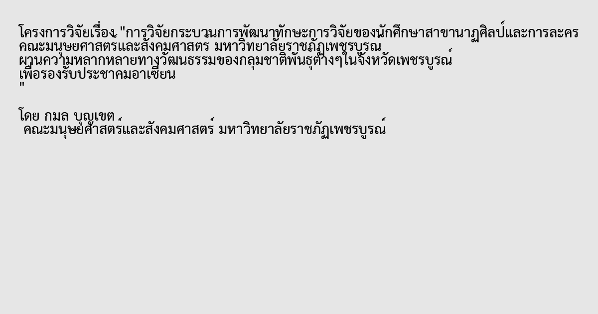 งานวิจัยนี้เป็นการวิจัยกระบวนการพัฒนาทักษะการวิจัยการจัดการความรู้ทางภาษาและวัฒนธรรมของนักศึกษาสาขานาฎศิลป์และการละคร ผ่านความหลากหลายทางวัฒนธรรมของกลุ่มชาติพันธุ์ต่างๆ ในจังหวัดเพชรบูรณ์เพื่อรองรับประชาคมอาเซียน โดยมีวัตถุประสงค์ 1)เพื่อศึกษากระบวนการพัฒนาทักษะการวิจัยของนักศึกษา และ 2)เพื่อให้ได้ข้อมูลวิธีการและเวลาที่ใช้ในการพัฒนาทักษะของนักศึกษา กลุ่มตัวอย่างได้แก่ นักศึกษาหลักสูตรสาขาวิชารัฐประศาสวนศาสตร์ ที่ลงทะเบียนเรียนสาขานาฎศิลป์ หมู่เรียนที่ 5911021391 และหมู่เรียนที่ 5911021392 กลุ่มละ 25 คน รวม 50 คน เครื่องมือที่ใช้ในการวิจัยได้แก่ แบบทดสอบผลการเรียนรู้และแบบทดสอบวัดผลสัมฤทธิ์ทางการเรียน การวิเคราะห์ข้อมูลโดยใช้ค่าคะแนน ค่าเฉลี่ย ส่วนเบี่ยงเบนมาตรฐาน ผลการวิจัยพบว่า 1) มีกระบวนการพัฒนาทักษะได้แก่ ทำการสอนกระบวนการวิจัย การค้นคว้า การถามตอบ และการนำเสนอผลงาน และได้พัฒนาการศึกษา การวิจัย อยู่ในระดับปานกลาง จากแบบประเมินทักษะตามสภาพจริง 2)ข้อมูลและววิธีการพัฒนาทักษะมีจำนวน 17 หัวข้อ โดยใช้ระยะเวลาในการพัฒนา 24 สัปดาห์