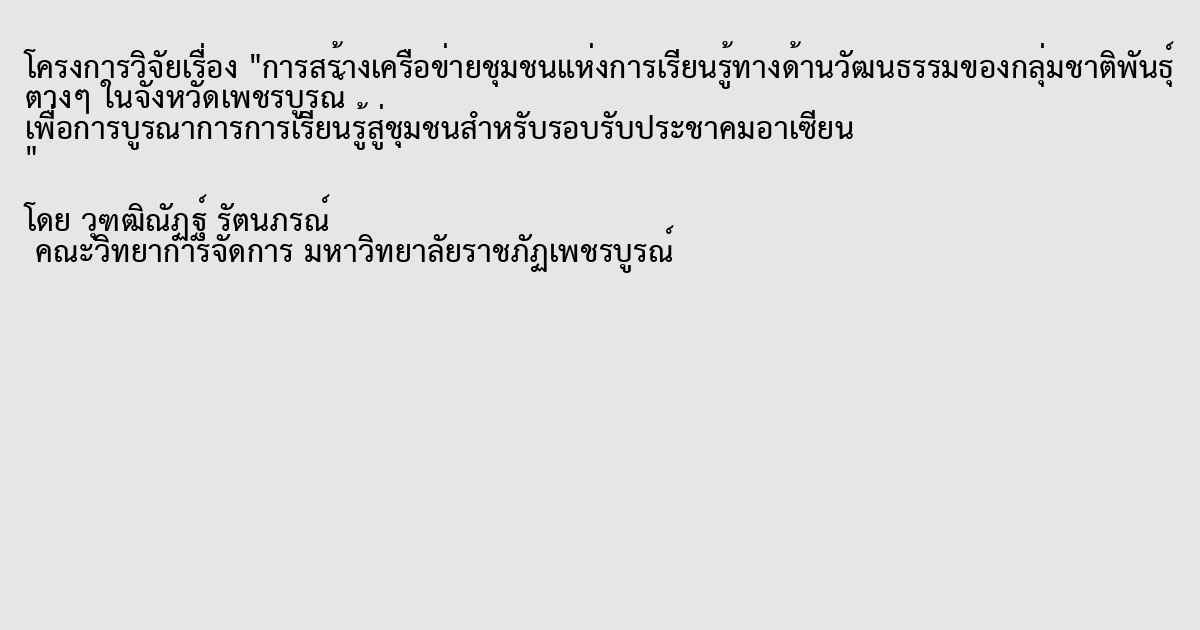 งานวิจัยนี้มีวัตถุประสงค์เพื่อ 1) ศึกษาบริบทชุมชน ประวัติศาสตร์ความเป็นมา ลักษณะทางกายภาพ/ชีวภาพของชุมชน ลักษณะประชากร ลักษณะทางเศรษฐกิจ ลักษณะทางสังคม ภาษา ระบบความเชื่อ ประเพณีและวัฒนธรรม 2) เพื่อศึกษาข้อจำกัด ปัญหาและอุปสรรคในการสร้างสังคมแห่งการเรียนรู้ทุนทางภาษาและวัฒนธรรมของจังหวัดเพชรบูรณ์อย่างยั่งยืน 3) เพื่อพัฒนารูปแบบการสร้างสังคมแห่งการเรียนรู้ทุนทางภาษาและวัฒนธรรมของจังหวัดเพชรบูรณ์อย่างยั่งยืน และ 4) เพื่อติดตามและประเมินผลการสร้างเครือข่ายชุมชนแห่งการเรียนรู้ทางด้านวัฒนธรรมของกลุ่มชาติพันธุ์ต่างๆ ในจังหวัดเพชรบูรณ์ เพื่อการบูรณาการการเรียนรู้สู่ชุมชนสำหรับรองรับประชาคมอาเซียนอย่างยั่งยืนประชากรที่ใช้ในการศึกษา ได้แก่ ชาวพื้นเมือง ชาวไทยหล่ม ชาวเขา (เผ่าม้ง เผ่าลีซอ เผ่าเย้า เผ่ามูเซอ) ชาวจีน ชาวบน ชาวลาว (ลาวพวน ลาวแง้ว ลาวครั่ง) ที่อาศัยอยู่ในจังหวัดเพชรบูรณ์ โดยการเลือกแบบเจาะจง เครื่องมือที่ใช้ในการวิจัยได้แก่ แบบสัมภาษณ์และแบบสังเกตพฤติกรรม การวิเคราะห์ข้อมูลโดยการสรุปและพรรณา ผลการวิจัยพบว่า 1) บริบทชุมชนพื้นที่เป็นภูเขาสูงชันมีเชื้อชาติไทย ศาสนาพุทธ มีความเชื่อประเพณี วัฒนธรรม คล้ายกัน 2) มีข้อจำกัดในเรื่องของขอบเขตของชุมชนในการปกครองและปัญหาในเรื่องผู้นำชุมชน 3) ไม่สามารถพัฒนารูปแบบการสร้างสังคมแห่งการเรียนรู้ได้เพราะต้องใช้งบประมาณมาก จะพัฒนาได้เฉพาะภายในกลุ่มชุมชนทุกกลุ่มในเวลาทำการวิจัย 4) การติดตามได้เฉพาะกลุ่มที่ดำเนินการเท่านั้นส่วนกล่มชุมชนทั้งหมดมารวมกันไม่ได้เพราะต้องใช้งบประมาณมาก