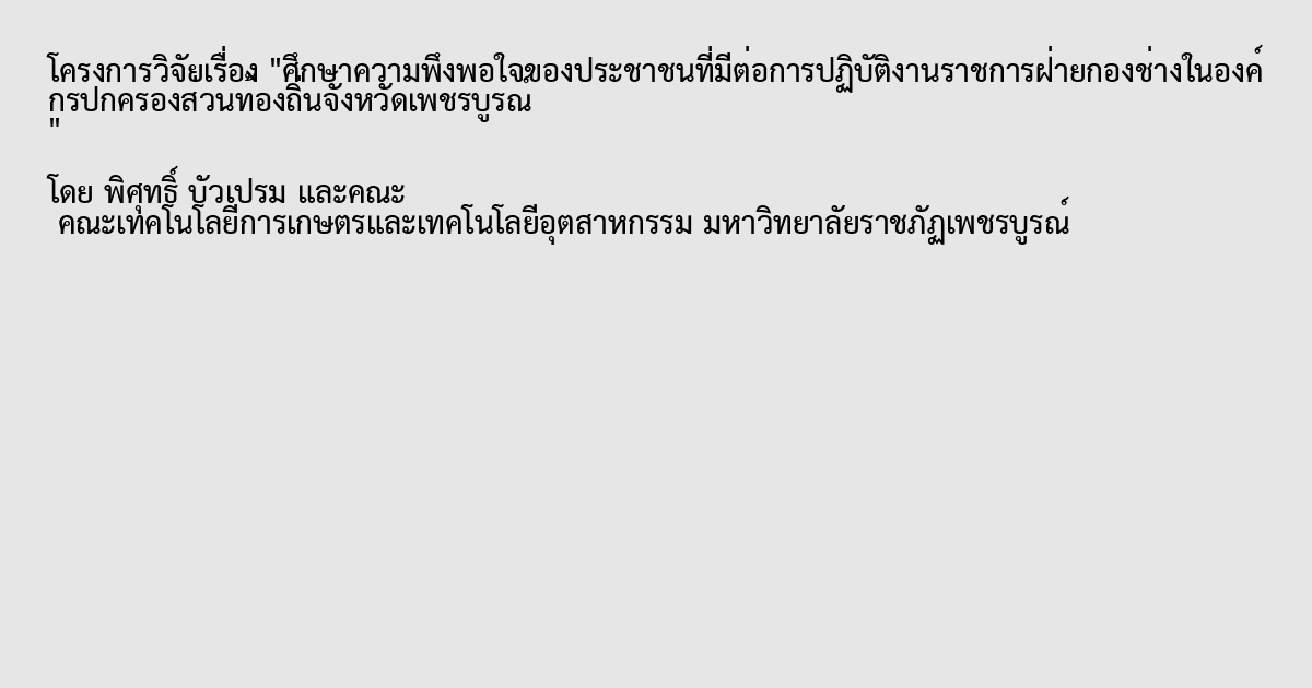ศึกษาความพึงพอใจ,ประชาชน,ฝ่ายกองช่าง,องค์กรปกครองส่วนท้องถิ่นจังหวัดเพชรบูรณ์,Satisfaction,Local governments Phetchabun Province,ความพึงพอใจ,ปฏิบัติงานราชการ,satisfaction,people,government work,technicians,local government organization in Phetchabun