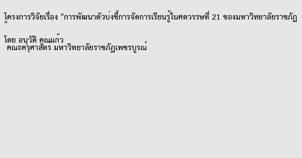 1. องค์ประกอบและตัวบ่งชี้การจัดการเรียนรู้ในศตวรรษที่ 21 ของมหาวิทยาลัยราชภัฏ ประกอบด้วย 5 องค์ประกอบ 52 ตัวบ่งชี้ ได้แก่ องค์ประกอบด้านการพัฒนาหลักสูตร จำนวน 12 ตัวบ่งชี้ ด้านการจัดการเรียนการสอน จำนวน 9 ตัวบ่งชี้ ด้านการพัฒนานักศึกษา จำนวน 12 ตัวบ่งชี้ ด้านการพัฒนาอาจารย์ผู้สอน จำนวน 11 ตัว และ ด้านการบริหารและการจัดการ จำนวน 8 ตัว