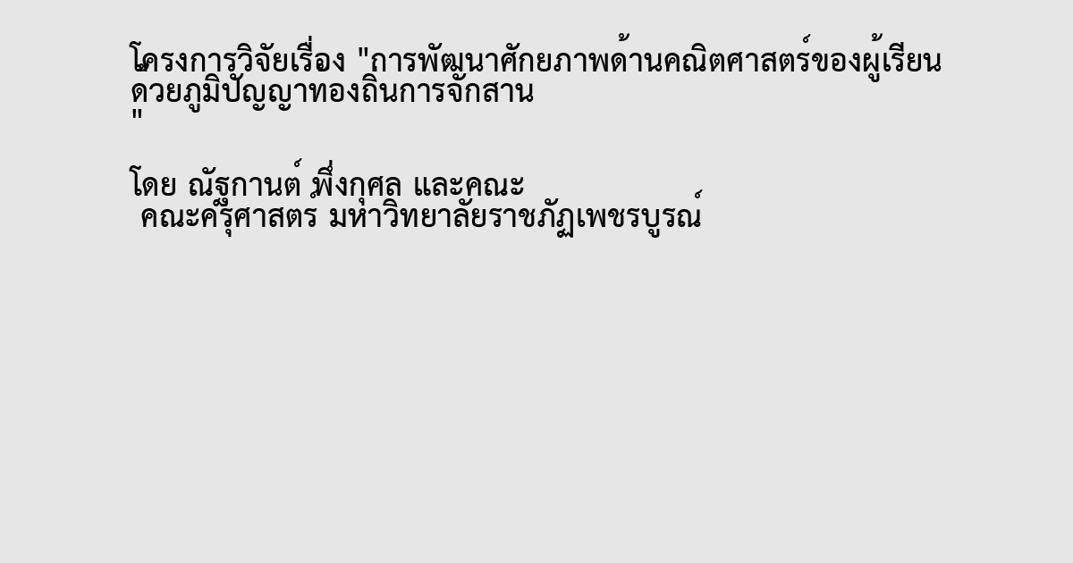 งานวิจัยเรื่องการพัฒนาศักยภาพด้านคณิตศาสตร์ของผู้เรียนด้วยภูมิปัญญาท้องถิ่นการจักสาน มีวัตถุประสงค์เพื่อพัฒนาหลักสูตรท้องถิ่นวิชาคณิตศาสตร์กันงานจักสาน วิธีดำเนินการวิจัยแบ่งออกเป็น 2 ขั้นตอน ประกอบด้วย 1. ขั้นการสร้างหลักสูตร และ 2. ขั้นการนำหลักสูตรไปใช้ แหล่งข้อมูลในการสร้างหลักสูตร คือ นักเรียนโรงเรียนบ้านรวมทรัพย์ และโรงเรียนบ้านสระประดู่ จังหวัดเพชรบูรณ์ แหล่งข้อมูลการนำหลักสูตรไปใช้ คือ นักเรียนโรงเรียนบุ่งคล้า และโรงเรียนนิยมศิลป์อนุสรณ์ จังหวัดเพชรบูรณ์ เครื่องมือที่ใช้ในการเก็บรวบรวมข้อมูล แบบสัมภาษณ์ปราชญ์ชาวบ้าน แบบสัมภาษณ์ตัวแทนผู้บริหาร ตัวแทนครูผู้สอน แบบประเมินหลักสูตร และแบบทดสอบวัดผลสัมฤทธิ์ทางการเรียน ผลการวิจัยพบว่า ปราชญ์ชาวบ้านมีอาชีพเกษตรกร ทอผ้า ทอเสื่อ เริ่มงานจักสานเป็นเวลามากกว่า 20 ปี เรียนรู้งานจักสานด้วยตนเองเริ่มต้นด้วยการดูตัวอย่างจากลายง่ายๆ เช่น ลายขัด ลายสอง วัสดุที่ใช้ในงานจักสานคือตอกไม้ไผ่และกก ด้านตัวแทนผู้บริหาร ให้ความสำคัญกับหลักสูตรท้องถิ่น เป็นการพัฒนาการเรียนรู้ของนักเรียนจากสิ่งใกล้ตัว ปัญหาของการทำหลักสูตรท้องถิ่นคือ ความเข้าใจของบุคลากรในการจัดทำหลักสูตรท้องถิ่น ในส่วนของตัวแทนครูผู้สอน เห็นความสำคัญในการจัดทำหลักสูตรท้องถิ่น ทำให้นักเรียนได้ศึกษาเรียนรู้เกี่ยวกับท้องถิ่นของตนเองมากขึ้น ควรมีการนำหลักสูตรแกนกลางมาประยุกต์ให้เข้ากับหลักสูตรของโรงเรียน มีการบูรณาการร่วมกับวิชาต่างๆ จึงได้พัฒนาหลักสูตร เรื่อง สานสวยด้วยคณิตศาสตร์ โดยบูรณาการกับวิชาคณิตศาสตร์ โดยมีองค์ประกอบ ของหลักสูตร คือ ความเป็นมาของหลักสูตร จุดประสงค์ของหลักสูตร คำอธิบายรายวิชา โครงสร้างหลักสูตร การวิเคราะห์ความสอดคล้องระหว่าง มาตรฐานการเรียนรู้และตัวชี้วัด และ แผนการจัดการเรียนรู้ มีความเหมาะสมสอดคล้องกัน ขั้นการสร้างหลักสูตรพบว่า ผลประเมินหลักสูตรภาพรวมอยู่ระดับ มาก ( = 4.05; S.D.= 0.77) ขั้นการนำหลักสูตรไปใช้ ผลประเมินหลักสูตรภาพรวมอยู่ระดับ มาก ( = 4.10; S.D.= 0.83) ในการทดสอบศักยภาพด้านคณิตศาสตร์ของผู้เรียน พบว่า คะแนนเฉลี่ยของนักเรียนหลังใช้หลักสูตรมากกว่าก่อนใช้หลักสูตรมีนัยสำคัญทางสถิติที่ระดับ .05