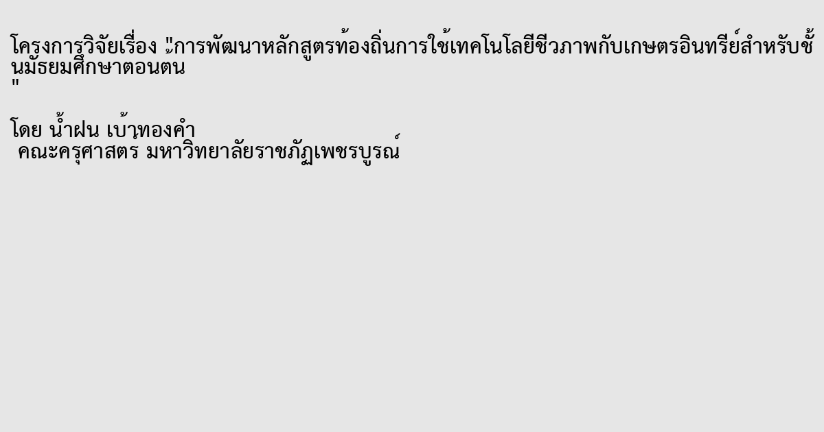 งานวิจัยนี้ มีวัตถุประสงค์ 1) เพื่อพัฒนาหลักสูตรท้องถิ่นการใช้เทคโนโลยีชีวภาพกับเกษตรอินทรีย์สำหรับนักเรียนชั้นมัธยมศึกษาตอนต้น 2) เพื่อหาประสิทธิภาพของหลักสูตรท้องถิ่นการใช้เทคโนโลยีชีวภาพกับเกษตรอินทรีย์สำหรับนักเรียนชั้นมัธยมศึกษาตอนต้น 3) เพื่อประเมินความพึ่งพอใจของผู้ใช้หลักสูตรท้องถิ่นการใช้เทคโนโลยีชีวภาพกับเกษตรอินทรีย์สำหรับนักเรียนชั้นมัธยมศึกษาตอนต้น และ 4) เพื่อพัฒนาทักษะการคิดสร้างสรรค์ การอภิปราย และพฤติกรรมการอยากรู้อยากเห็นของนักเรียนก่อนและหลังการใช้หลักสูตร