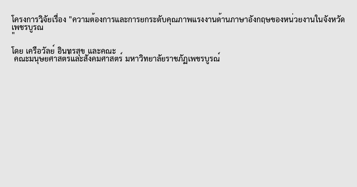 งานวิจัยนี้นำเสนอความต้องการและการยกระดับคุณภาพแรงงานด้านภาษาอังกฤษของหน่วยงานในจังหวัดเพชรบูรณ์ โดยมีวัตถุประสงค์ 2 ประการได้แก่ (1) เพื่อศึกษาคุณลักษณะแรงงานมีทักษะภาษาอังกฤษที่ต้องการของหน่วยงานในจังหวัดเพชรบูรณ์ และ (2) เพื่อนำเสนอข้อมูลประกอบการพิจารณาจัดทำหลักสูตรการอบรมภาษาอังกฤษระยะสั้นที่เหมาะสมสำหรับแรงงานของหน่วยงานในจังหวัดเพชรบูรณ์