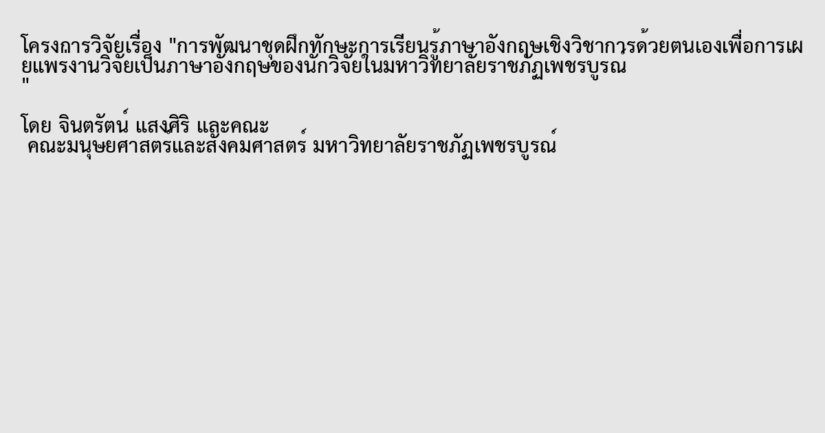 การวิจัยครั้งนี้มีจุดประสงค์ เพื่อการพัฒนาชุดฝึกทักษะการเรียนรู้ภาษาอังกฤษเชิงวิชาการด้วยตนเองเพื่อการเผยแพร่งานวิจัยเป็นภาษาอังกฤษของนักวิจัยในมหาวิทยาลัยราชภัฏเพชรบูรณ์ เพื่อเปรียบเทียบความสามารถทางภาษาอังกฤษเชิงวิชาการของอาจารย์ก่อนและหลังการใช้ชุดฝึกทักษะการเรียนรู้ภาษาอังกฤษเชิงวิชาการด้วยตนเอง กลุ่มตัวอย่างคือ อาจารย์ผู้ที่ทำวิจัยในมหาวิทยาลัยราชภัฏเพชรบูรณ์โดยการสุ่มอย่างง่าย ได้อาจารย์ที่เป็นกลุ่มตัวอย่างจำนวน 60 คน ใช้วิธีการทดลองโดยให้อาจารย์ชุดฝึกทักษะการเรียนรู้ภาษาอังกฤษเชิงวิชาการด้วยตนเองที่ผู้วิจัยสร้างขึ้นจำนวน 3 บท ใช้เวลา 8 สัปดาห์ และทำแบบทดสอบก่อนและหลังการใช้บทเรียน 2 สัปดาห์ รวมใช้เวลาในการทดลอง 10 สัปดาห์ เครื่องมือที่ใช้ในการวิจัยประกอบด้วย 1) ชุดฝึกทักษะการเรียนรู้ภาษาอังกฤษเชิงวิชาการด้วยตนเองบนเครือข่ายอินเตอร์เน็ต 2) แบบทดสอบวัดความสามารถทางการภาษาอังกฤษเชิงวิชาการทางอ้อมและทางตรงที่ใช้ทดสอบก่อนและหลังการทดลอง