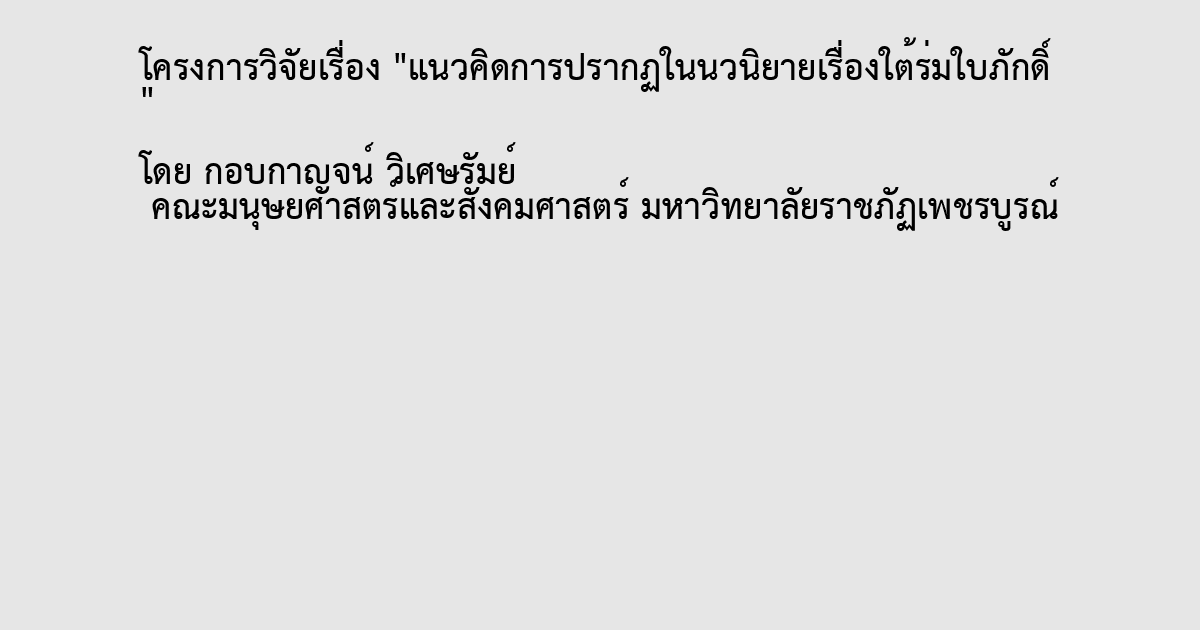 งานวิจัยเรื่องนี้มีวัตถุประสงค์เพื่อวิเคราะห์แนวคิดที่ปรากฏในนวนิยายเรื่องใต้ร่มใบภักดิ์ ของ ชมจันท์ และนำเสนอผลการวิจัยด้วยวิธีพรรณนาวิเคราะห์ ผลการศึกษา พบว่าแนวคิดที่ปรากฏในนวนิยายเรื่องใต้ร่มใบภักดิ์ มีดังนี้