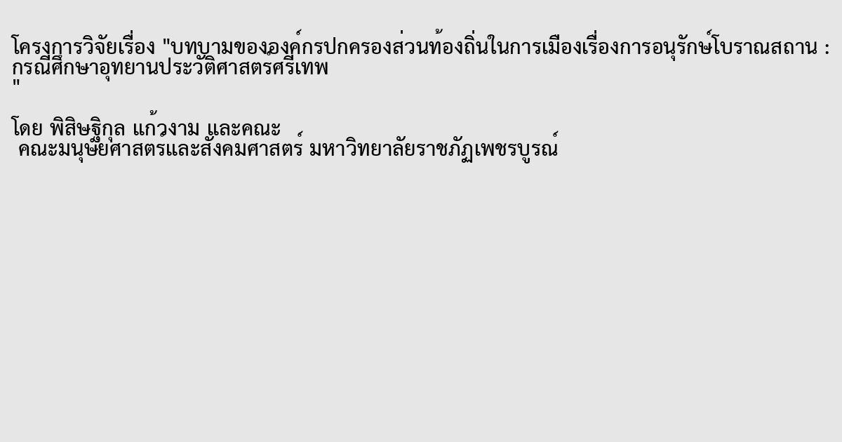 งานวิจัยเป็นงานวิจัยเชิงคุณภาพมีวัตถุประสงค์เพื่อพิจารณาการเมืองในการสร้างความร่วมมือระหว่างองค์กรปกครองส่วนตำบลศรีเทพ กับอุทยานประวัติศาสตร์ศรีเทพ และเพื่อทราบแนวทางบทบาทขององค์กรปกครองส่วนตำบลศรีเทพในการร่วมอนุรักษ์โบราณสถานในอุทยานประวัติศาสตร์ศรีเทพ ผู้ให้ข้อมูลสำคัญ คือ ตัวแทนจากองค์กรปกครองส่วนตำบลศรีเทพ จำนวน 1 คน ตัวแทนจากอุทยานประวัติศาสตร์ศรีเทพ จำนวน 1 คน และประชาชนในพื้นที่ที่ได้จากการอ้างอิงต่อเนื่องปากต่อปาก จำนวน 20 คนคน ระยะเวลาในการดำเนินการวิจัยคือ ภาคการศึกษาที่ 1 /2559 เครื่องมือที่ใช้ในการวิจัยครั้งนี้ เป็นแบบสัมภายณ์ แบบมี โครงสร้าง ที่มีฐานจากมโนทัศน์รวบยอด ว่าด้วย "การแก้ไขความขัดแงเพื่อสร้างการอนุรักษ์โบราณสถานอย่างมีส่วนร่วม"