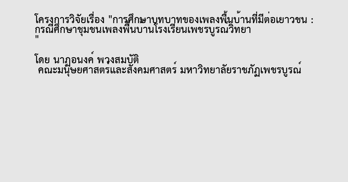 การศึกษาบทบาทของเพลงพื้นบ้านที่มีต่อเยาวชน : กรณีศึกษาชุมชนเพลงพื้นบ้านโรงเรียนเพชรบูรณ์วิทยา