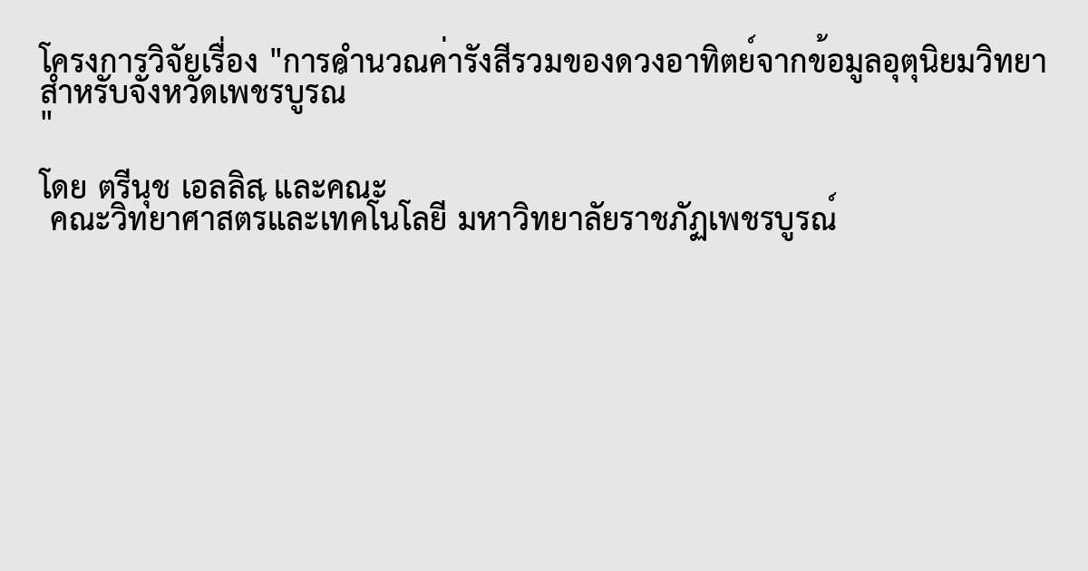 คำสำคัญ : รังสีรวม , ข้อมูลอุตุนิยมวิทยา , จังหวัดเพชรบูรณ์