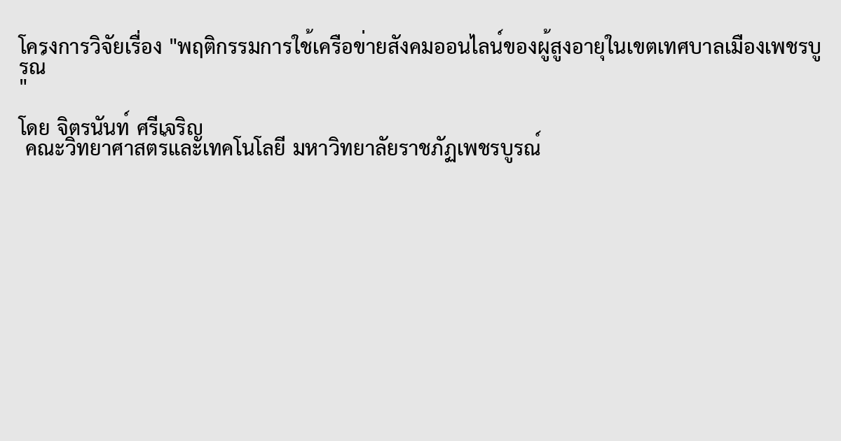 งานวิจัยนี้มีวัตถุประสงค์เพื่อศึกษาพฤติกรรมการใช้ แรงจูงใจ และความพึงพอใจในการใช้เครือข่ายสังคมออนไลน์ของผู้สูงอายุในเขตเทศบาลเมืองเพชรบูรณ์ เพื่อศึกษาและเปรียบเทียบความพึงพอใจในการใช้เครือข่ายสังคมออนไลน์ของผู้สูงอายุในเขตเทศบาลเมืองเพชรบูรณ์ จำแนกตามปัจจัยส่วนบุคคล เพื่อศึกษาและเปรียบเทียบความพึงพอใจในการใช้เครือข่ายสังคมออนไลน์ของผู้สูงอายุในเขตเทศบาลเมืองเพชรบูรณ์ จำแนกตามพฤติกรรมการใช้เครือข่ายสังคมออนไลน์ และเพื่อศึกษาความสัมพันธ์ระหว่างแรงจูงใจในการใช้เครือข่ายสังคมออนไลน์กับความพึงพอใจในการใช้เครือข่ายสังคมออนไลน์