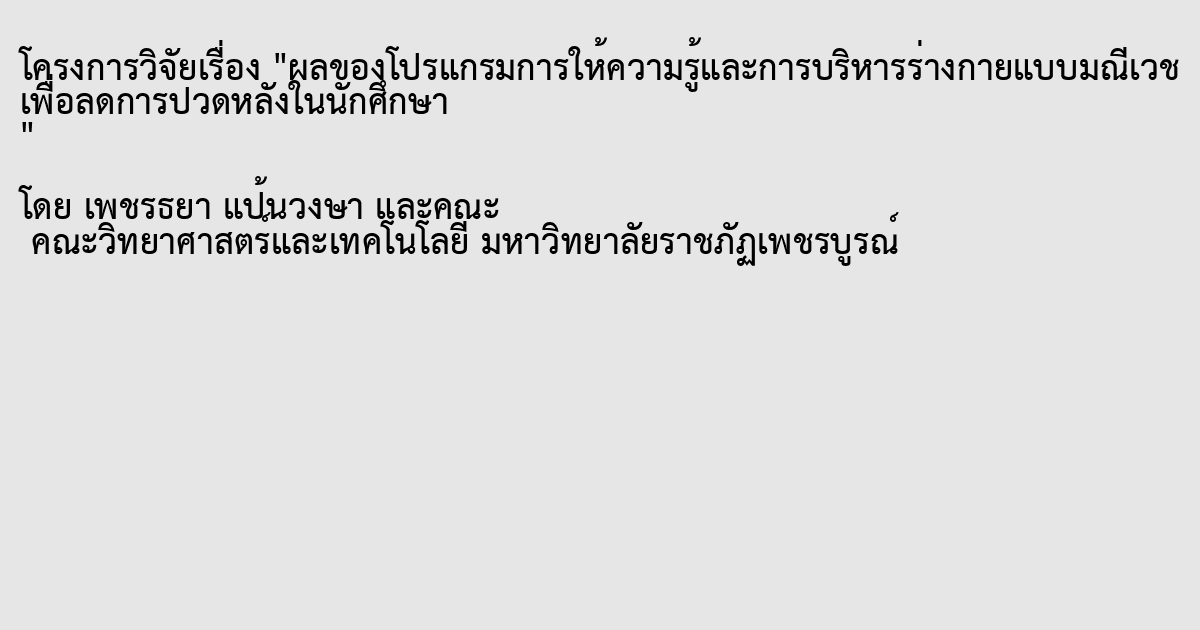 การวิจัยกึ่งทดลอง มีวัตถุประสงค์ เพื่อเปรียบเทียบค่าเฉลี่ยการปวดหลังก่อนและหลังการเข้าร่วมโปรแกรมการให้ความรู้และการบริหารร่างกายแบบมณีเวช เพื่อลดการปวดหลังในนักศึกษา กลุ่มตัวอย่างเป็นนักศึกษาคณะวิทยาศาสตร์และเทคโนโลยี มหาวิทยาลัยราชภัฏเพชรบูรณ์ที่มีการปวดหลัง จำนวน 60 คน โดยกลุ่มตัวอย่างเข้าร่วมโปรแกรมการให้ความรู้และการบริหารร่างกายแบบมณีเวช ประกอบด้วย การสอน การรับรู้โอกาสเสี่ยง ความรุนแรง ของการปวดหลัง การรับรู้ประโยชน์และอุปสรรคของการปฏิบัติตามคำแนะเรื่องการปวดหลัง พร้อมฝึกปฏิบัติการบริหารร่างกายแบบมณีเวช จำนวน 4 ครั้ง แต่ละครั้งห่างกัน 1 สัปดาห์ เครื่องมือที่ใช้ในการวิจัยประกอบด้วย 1) เครื่องมือการรวบรวมข้อมูลทั่วไป เป็นแบบสอบถาม แบบประเมินความเจ็บปวด (numeric rating scale) 2) เครื่องมือที่ใช้ในการทดลอง ได้แก่โปรแกรมให้ความรู้และการบริหารร่างกายแบบมณีเวช การวิเคราะห์ข้อมูลใช้สถิติเชิงพรรณนาและทดสอบค่าเฉลี่ยของประชากร 2 กลุ่มสัมพันธ์กัน (Paired t-test )