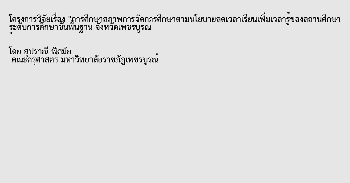 การวิจัย เรื่อง การศึกษาสภาพการจัดการศึกษาตามนโยบายลดเวลาเรียนเพิ่มเวลารู้ของสถานศึกษาระดับการศึกษาขั้นพื้นฐาน จังหวัดเพชรบูรณ์ มีวัตถุประสงค์ 1) เพื่อศึกษาสภาพการจัดการศึกษาตามนโยบายลดเวลาเรียนเพิ่มเวลารู้ของสถานศึกษาระดับการศึกษาขั้นพื้นฐาน จังหวัดเพชรบูรณ์ 2) เพื่อเปรียบเทียบสภาพการจัดการศึกษาตามนโยบายลดเวลาเรียนเพิ่มเวลารู้ ของโรงเรียนขนาดเล็ก ขนาดกลาง และขนาดใหญ่ ของสถานศึกษาระดับการศึกษาขั้นพื้นฐาน จังหวัดเพชรบูรณ์ กลุ่มตัวอย่าง ซึ่งได้มาจากการสุ่มตัวอย่างแบบหลายขั้นตอน ประกอบด้วย 1) การสุ่มแบบแบ่งชั้น ตามขนาดของโรงเรียน 3 ขนาด ได้แก่ ขนาดเล็ก ขนาดกลาง และขนาดใหญ่ 2) การสุ่มอย่างง่ายด้วยวิธีการจับฉลาก โดยใช้โรงเรียนเป็นหน่วยสุ่ม จำแนกเป็น โรงเรียนขนาดเล็ก ขนาดกลาง และขนาดใหญ่ ขนาดละ 3 โรงเรียน รวมจำนวนทั้งสิ้น 9 โรงเรียน เครื่องมือที่ใช้ในการวิจัย ประกอบด้วย แบบสอบถาม และแบบสัมภาษณ์ สถิติที่ใช้การวิเคราะห์ข้อมูลเชิงปริมาณที่ได้จากแบบสอบถาม คือ ค่าเฉลี่ย ส่วนเบี่ยงเบนมาตรฐาน และค่า F ส่วนการวิเคราะห์ข้อมูลเชิงคุณภาพใช้วิธีการวิเคราะห์เนื้อหาที่ได้จากการสัมภาษณ์