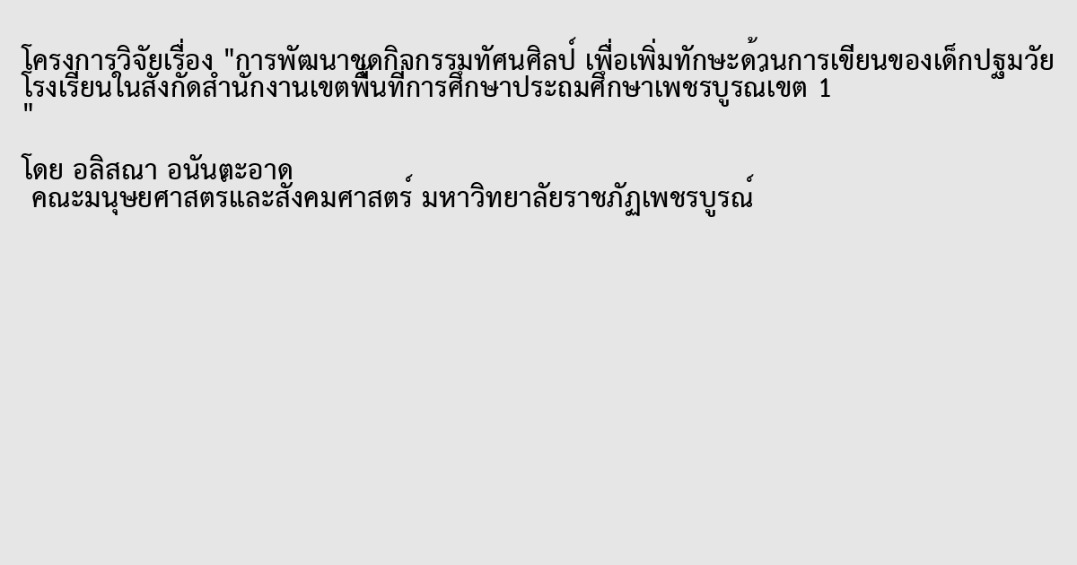 การวิจัยครั้งนี้มีวัตถุประสงค์เพื่อ(1)เพื่อพัฒนาชุดกิจกรรมทัศนศิลป์เพื่อเพิ่มทักษะด้านการเขียนของเด็กปฐมวัย(2)เพื่อเปรียบเทียบความสามารถด้านการเขียนของเด็กปฐมวัยก่อนและหลังการใช้ชุดกิจกรรมทัศนศิลป์ กลุ่มตัวอย่างที่ใช้ในการวิจัยคือเด็กปฐมวัยโรงเรียนในสังกัดสำนักงานเขตพื้นที่การศึกษาประถมศึกษาเพชรบูรณ์เขต1ใช้วิธีการเลือกกลุ่มตัวอย่างจากประชากรโดยใช้วิธีการสุ่มแบบง่ายแบบจับฉลากแบ่งกลุ่มได้กลุ่มตัวอย่างจำนวน60คนนำมาแบ่งเป็น2กลุ่มคือกลุ่มทดลองใช้ชุดกิจกรรมทัศนศิลป์จำนวน30คนและกลุ่มที่ไม่ใช้ชุดกิจกรรมทัศนศิลป์จำนวน30คนเท่ากัน เครื่องมือที่ใช้ในการวิจัยได้แก่(1)ชุดกิจกรรมทัศนศิลป์จำนวน6ชุด ใช้เวลาในการใช้ชุดกิจกรรม 1โมง สัปดาห์ละ2ครั้ง รวมเวลาที่ใช้ในการสอน12ชั่วโมง (2)แบบทดสอบวัดความสามารถในการเขียนโดยผ่านผู้เชียวชาญวิเคราะห์หาค่าคุณภาพโดยการหาค่าIOCแล้วนำไปใช้ทดลองกับกลุ่มตัวอย่าง (3)วิเคราะห์ข้อมูลโดยใช้ร้อยละค่าเฉลี่ย ค่าเบี่ยงเบนมาตรฐาน และการทดสอบค่าt