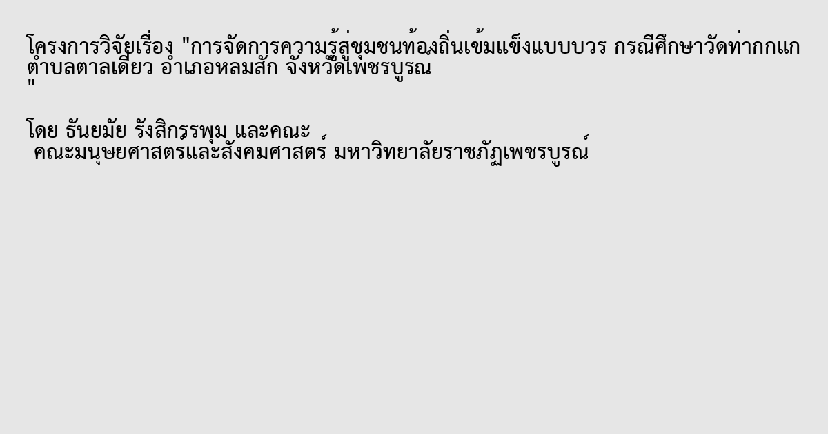 การวิจัยครั้งนี้มีวัตถุประสงค์เพื่อศึกษาสภาพการณ์การจัดการความรู้ในชุมชนวัดท่ากกแก ตำบลตาลเดี่ยว อำเภอหล่มสัก จังหวัดเพชรบูรณ์ และการจัดการความรู้สู่ชุมชนท้องถิ่นเข้มแข็งระหว่าง บ้าน วัด โรงเรียน ในชุมชนวัดท่ากกแก ตำบลตาลเดี่ยว อำเภอหล่มสัก จังหวัดเพชรบูรณ์เป็นการสำรวจชุมชน โดยใช้การสังเกตอย่างมีส่วนร่วมและการสัมภาษณ์เชิงลึก ประชากรที่ใช้ในการศึกษา คือ ประชาชนและผู้นำชุมชนในชุมชนวัดท่ากกแก ได้แก่ ผู้อาวุโส ปราชญ์ชาวบ้าน เยาวชน ผู้ใหญ่บ้าน ครู เจ้าอาวาส จำนวน 30 คนโดยการเลือกกลุ่มตัวอย่างแบบเฉพาะเจาะจง และทำการวิเคราะห์ข้อมูลโดยใช้การวิเคราะห์เชิงเนื้อหา